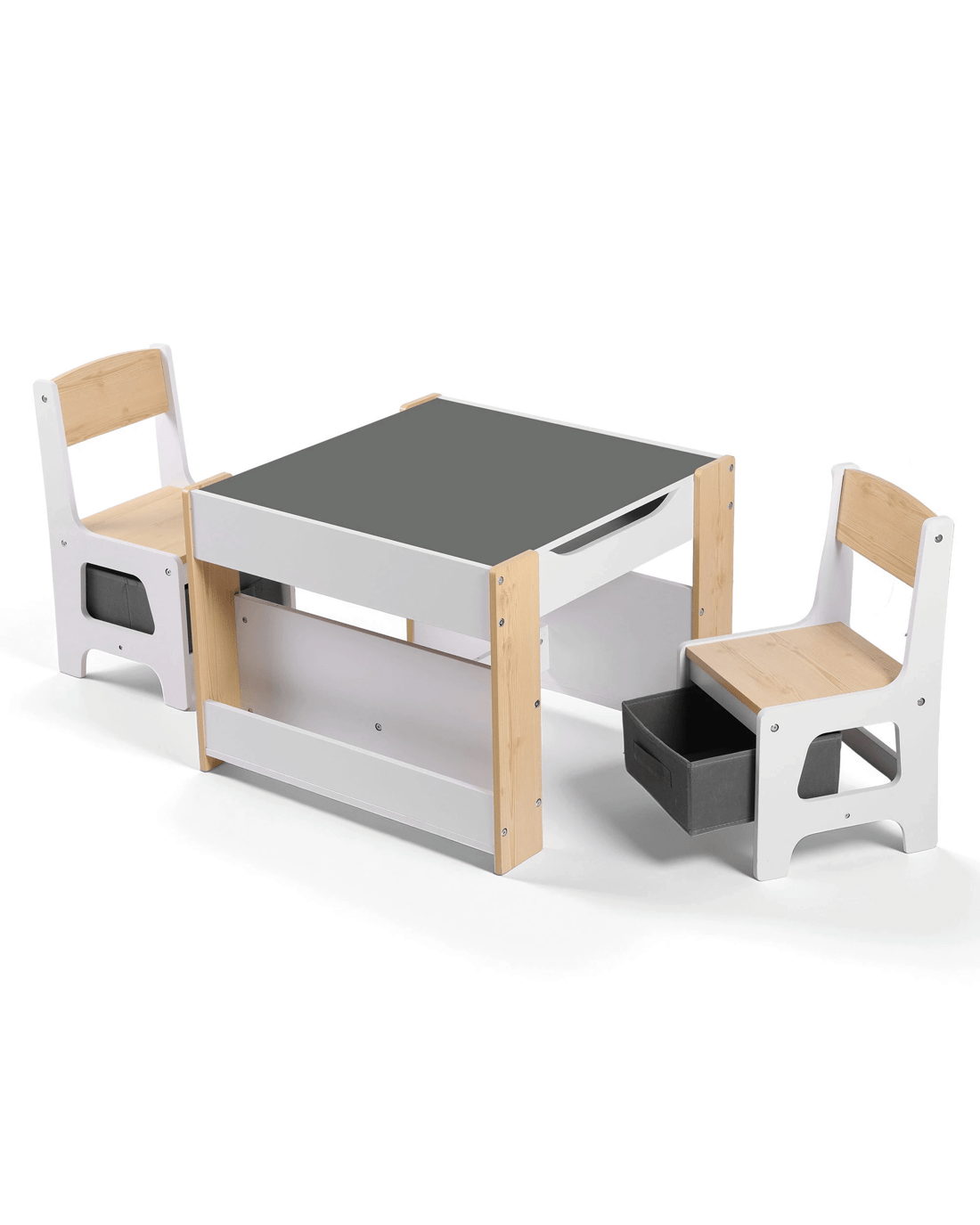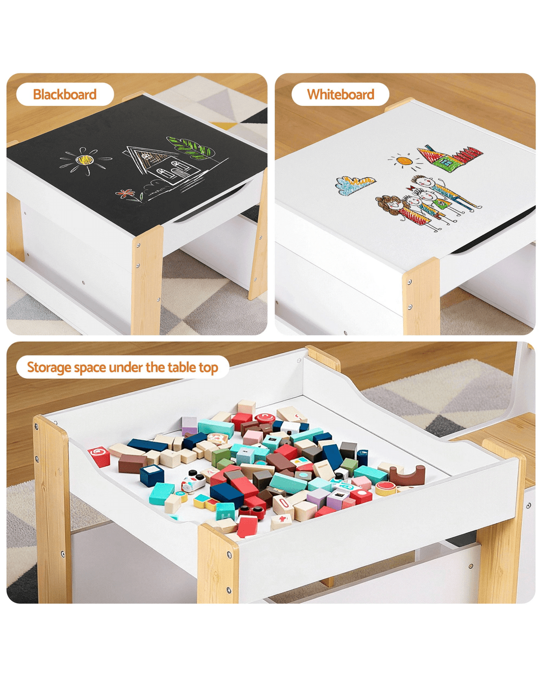 Reversible & Detachable Tabletop – Whiteboard on one side and blackboard on the other, suitable for drawing, writing, reading and crafts.