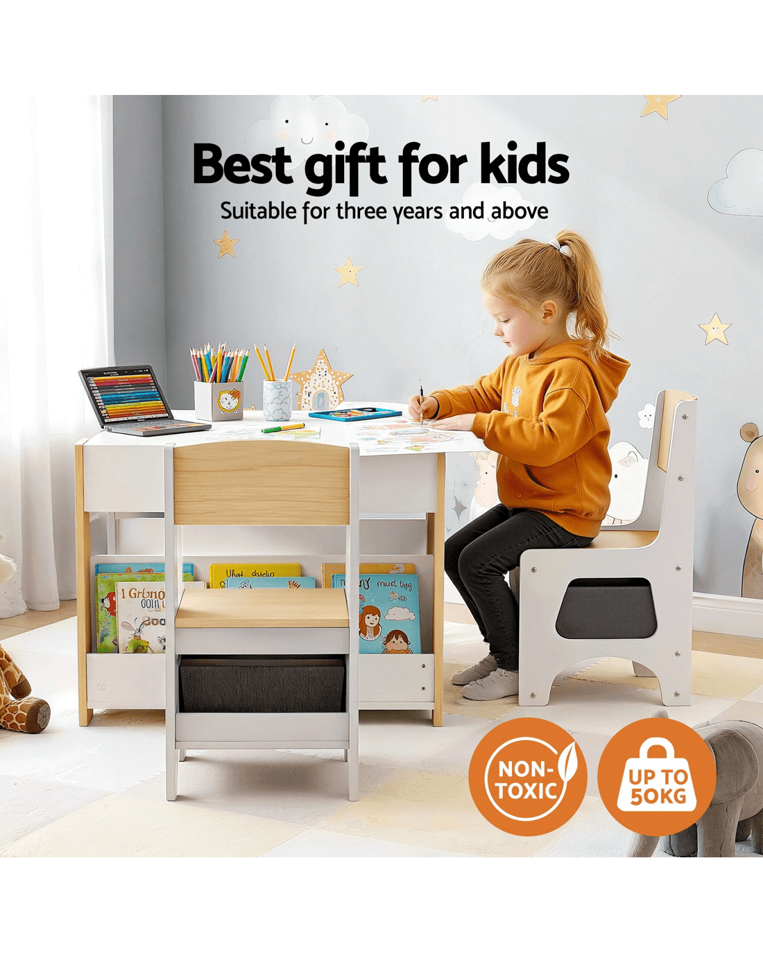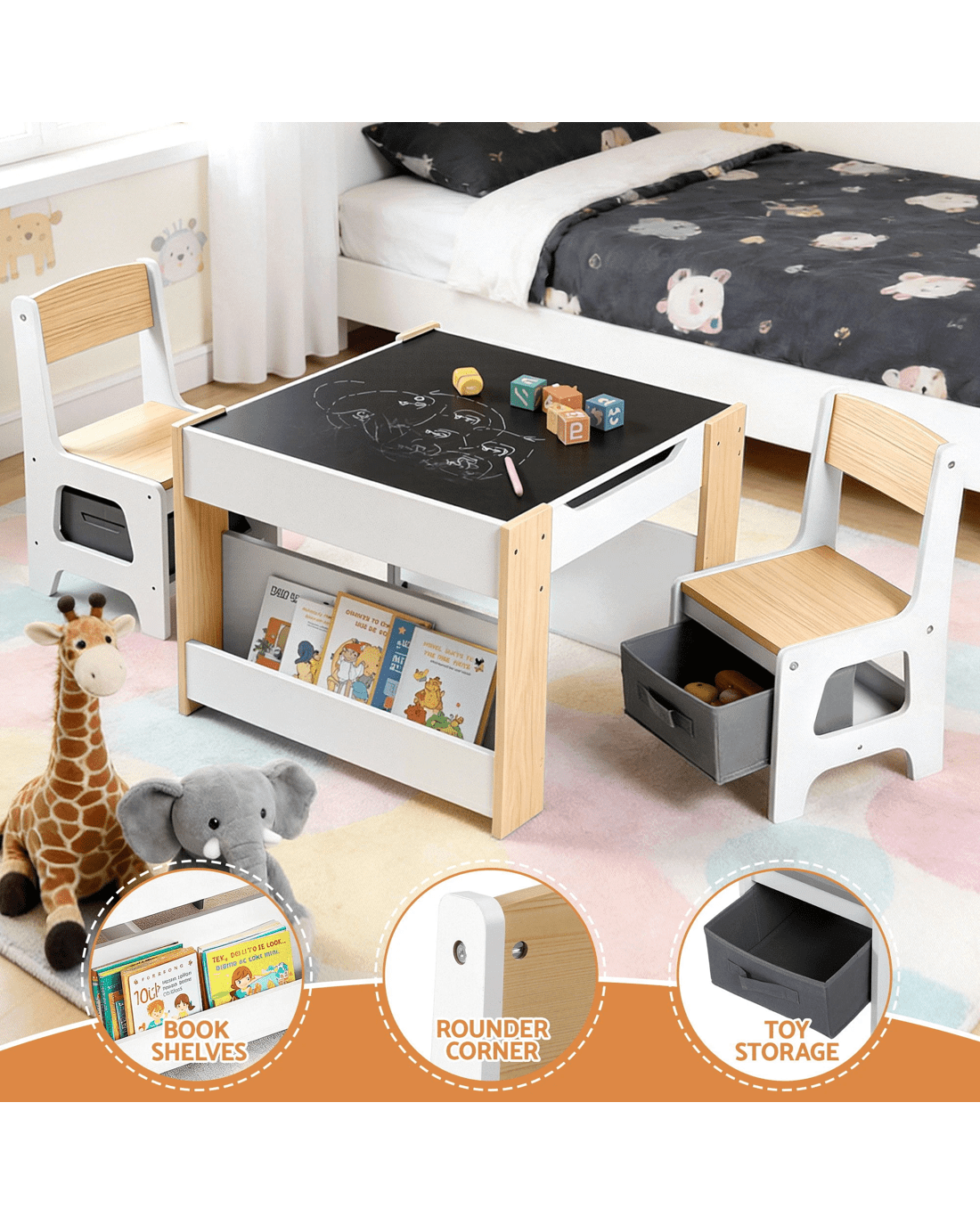 Hidden & Accessible Storage – Built-in bookshelf, under-table storage and storage boxes under each chair help keep toys and books organised.