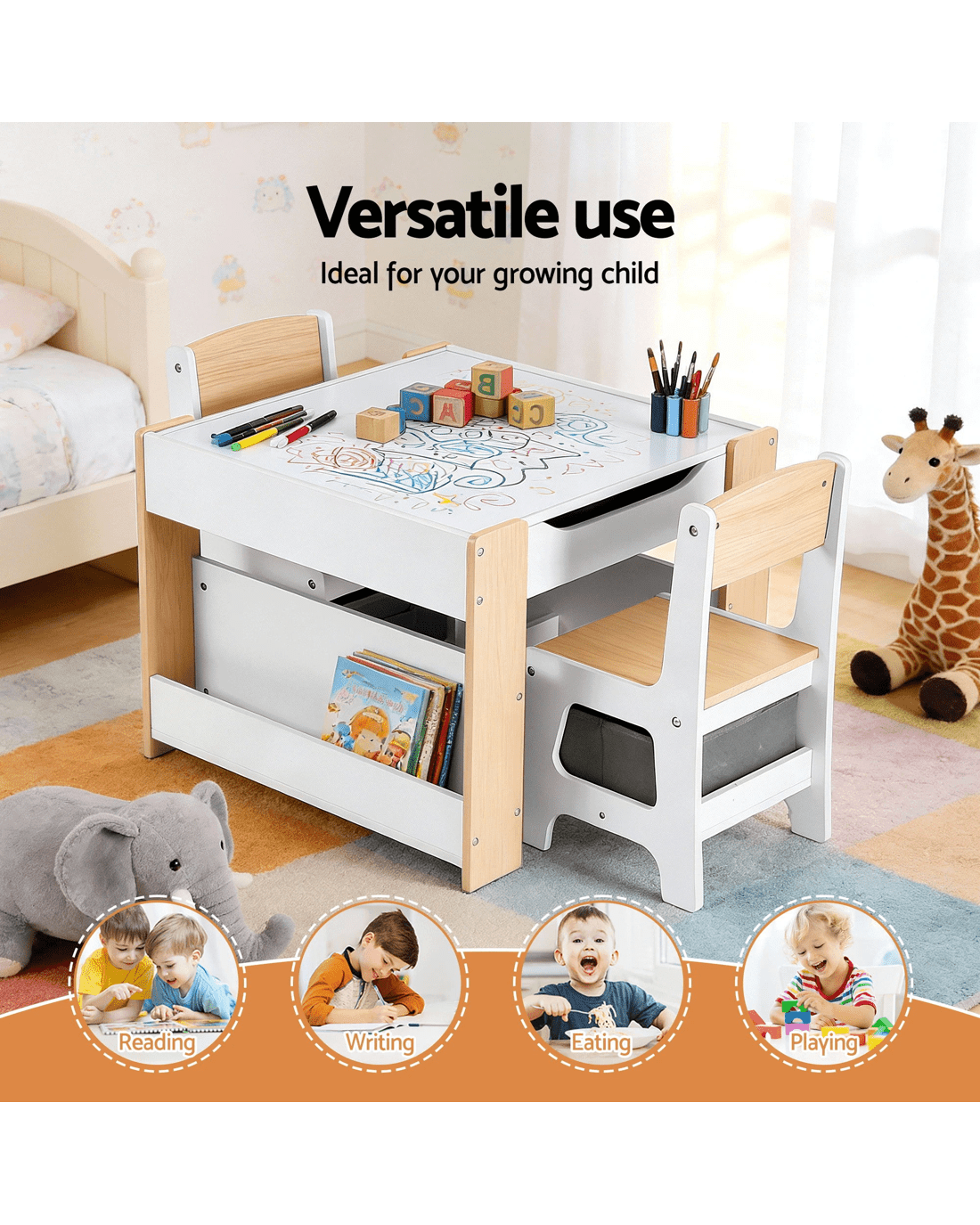 This multifunctional kids table and chairs set creates a dedicated space for learning, creativity and play. Featuring a reversible tabletop, smart storage solutions and a child-friendly design, it supports everyday activities while keeping rooms neat and organised.