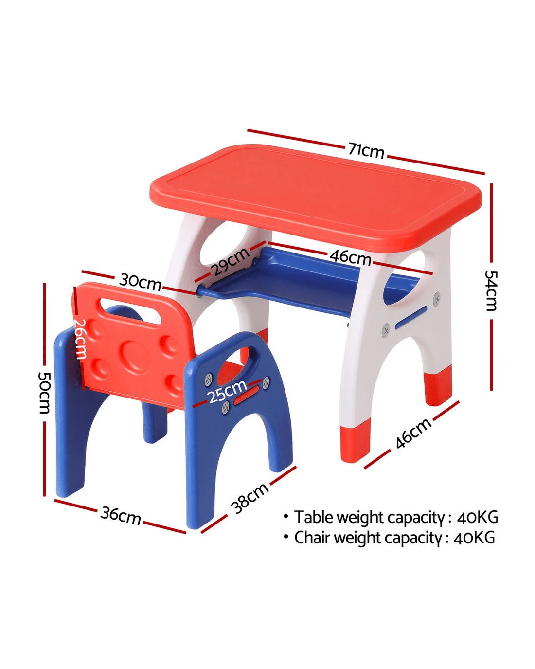 High Weight Capacity: Impressive 40kg load capacity for both the table and chair, ensuring superior stability.