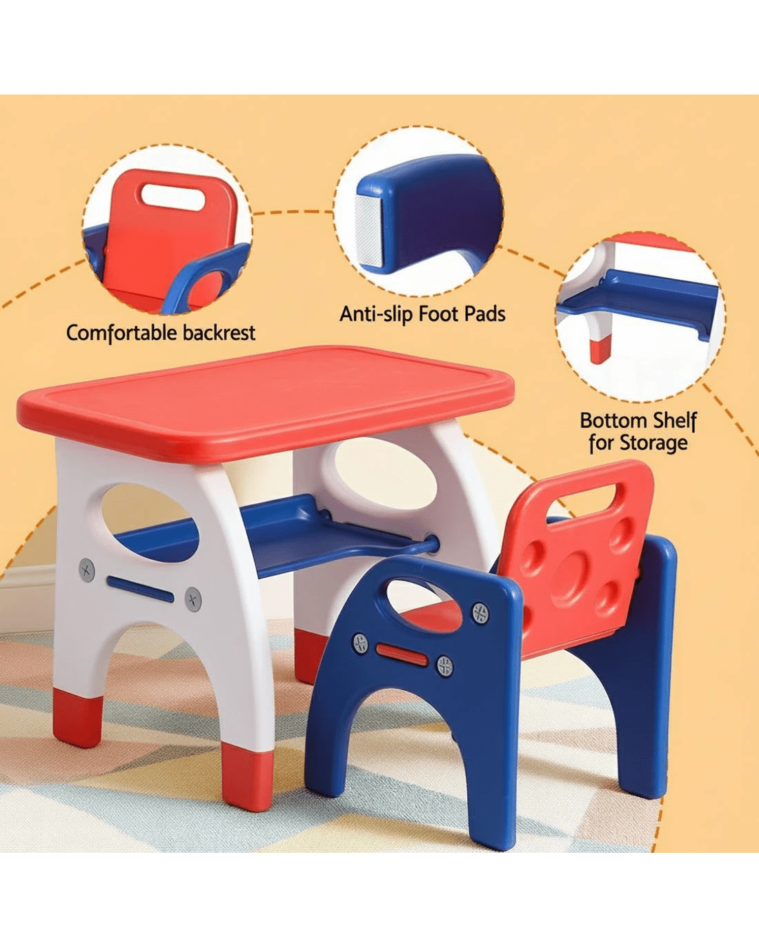 Child-Safe Design: Features smooth, rounded corners and an ergonomic chair for comfortable support.