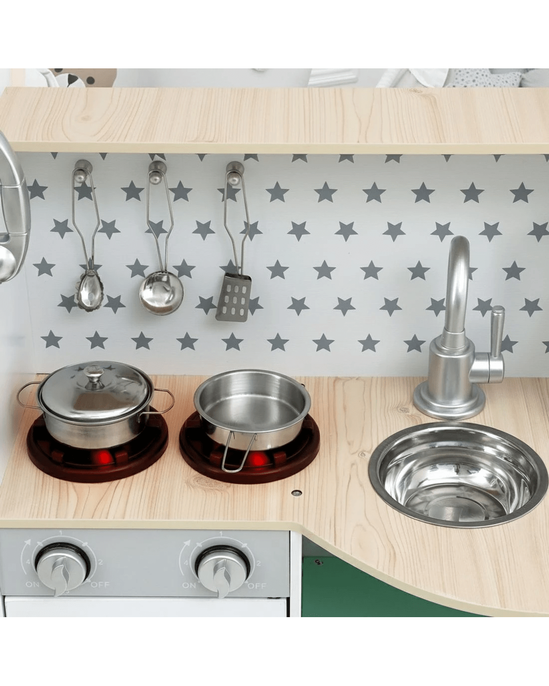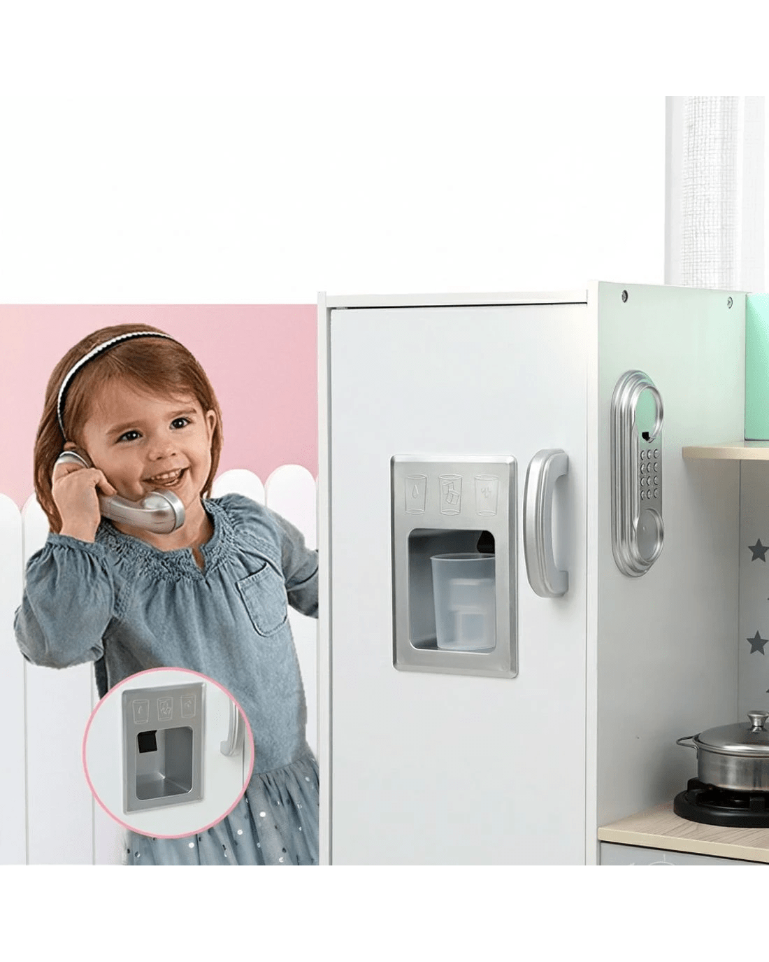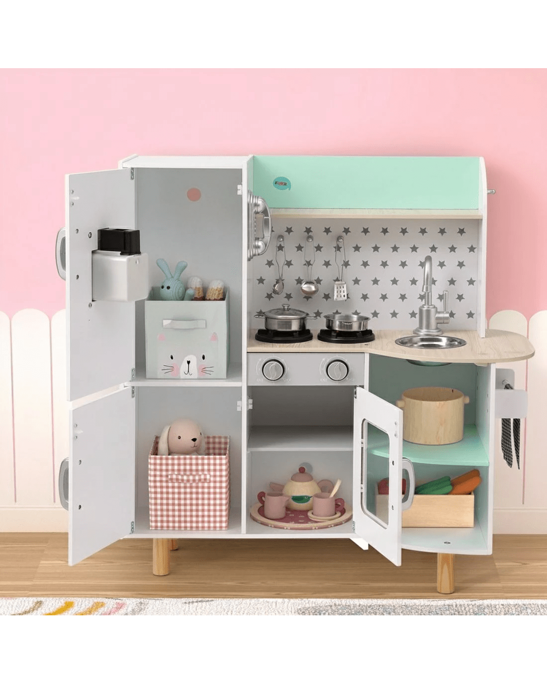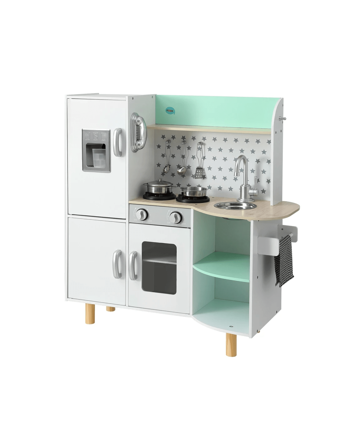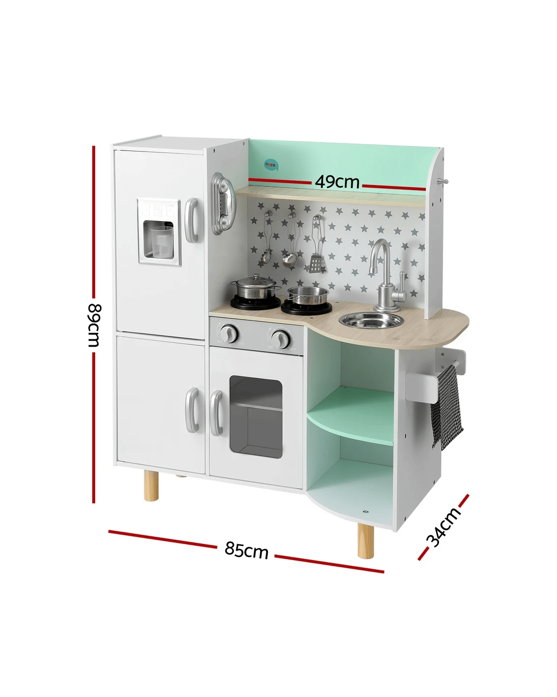 Explore imaginative play with our Keezi Wooden Kitchen Play set. Crafted from sturdy MDF and solid wood with a non-toxic paint finish, it features a smooth surface for easy cleaning. Includes cooking accessories, a fully operational oven door, turnable oven knobs, and a telephone for orders.