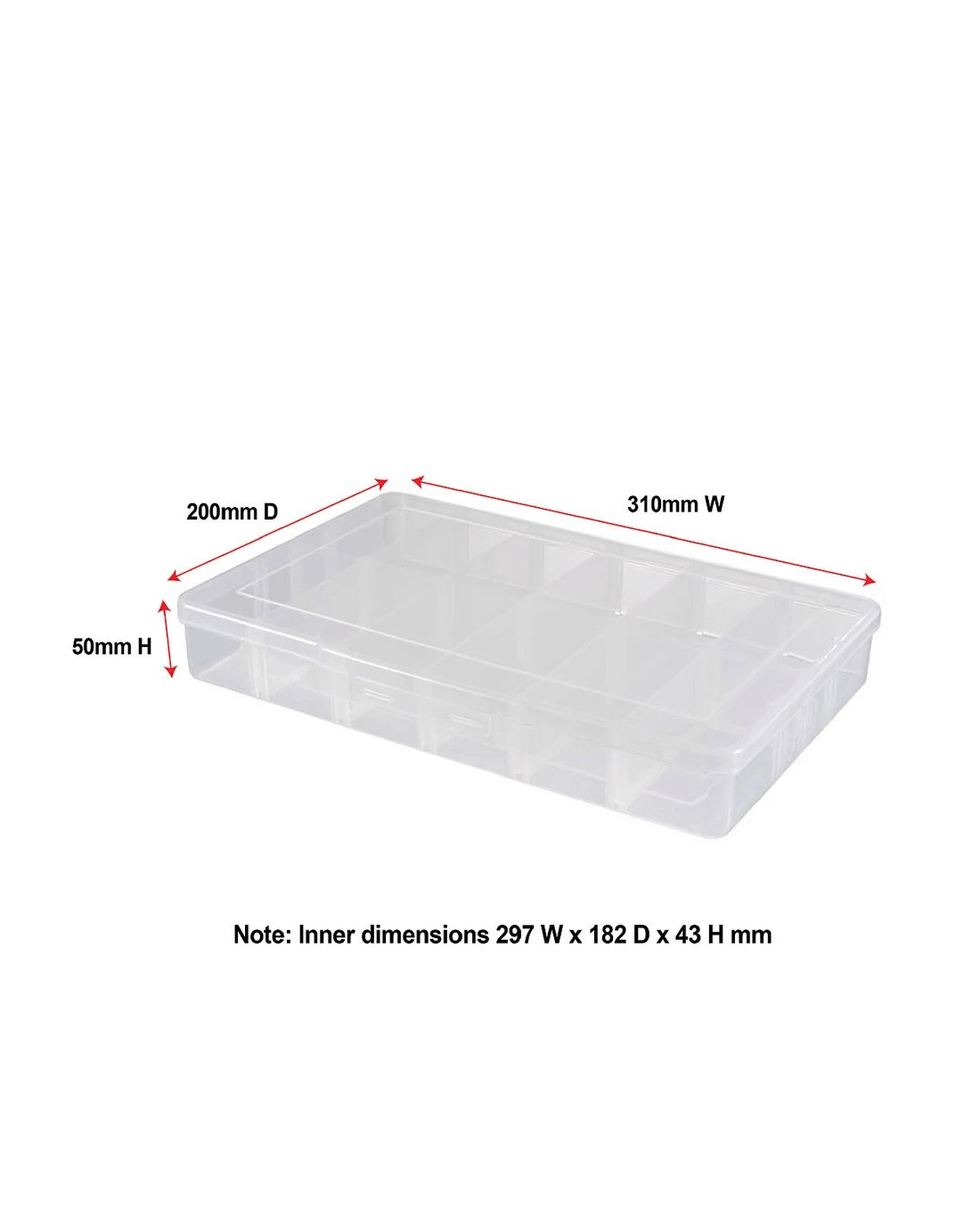 - The inner dimensions are 297 W x 182 D x 43 H mm.
