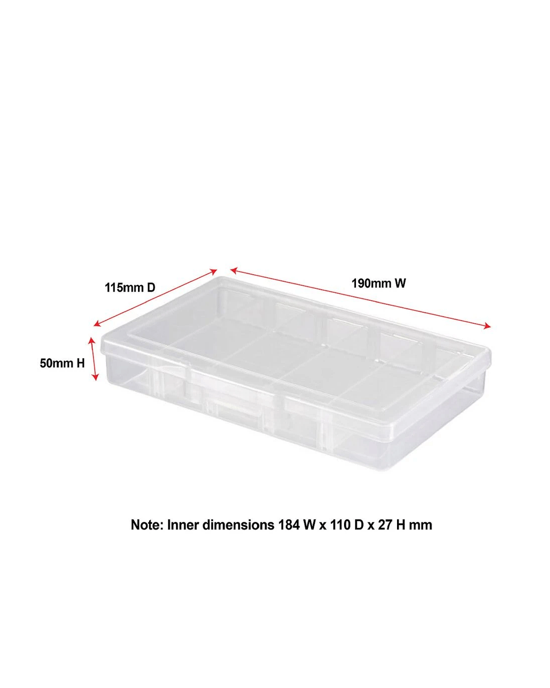 - The inner dimensions are 184 W x 110 D x 27 H mm.