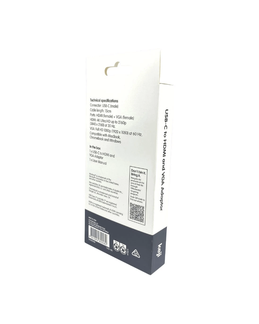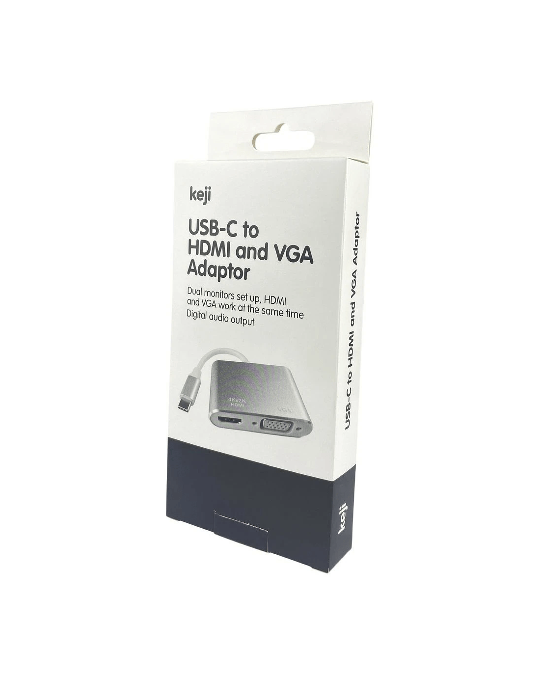 This Keji Adapter enables a fully functional USB-C device to display a duplicated screen via HDMI and VGA with resolution up to 1080p at 60 Hz. When only the HDMI is in use, the maximum resolution is up to 4K at 30 Hz.