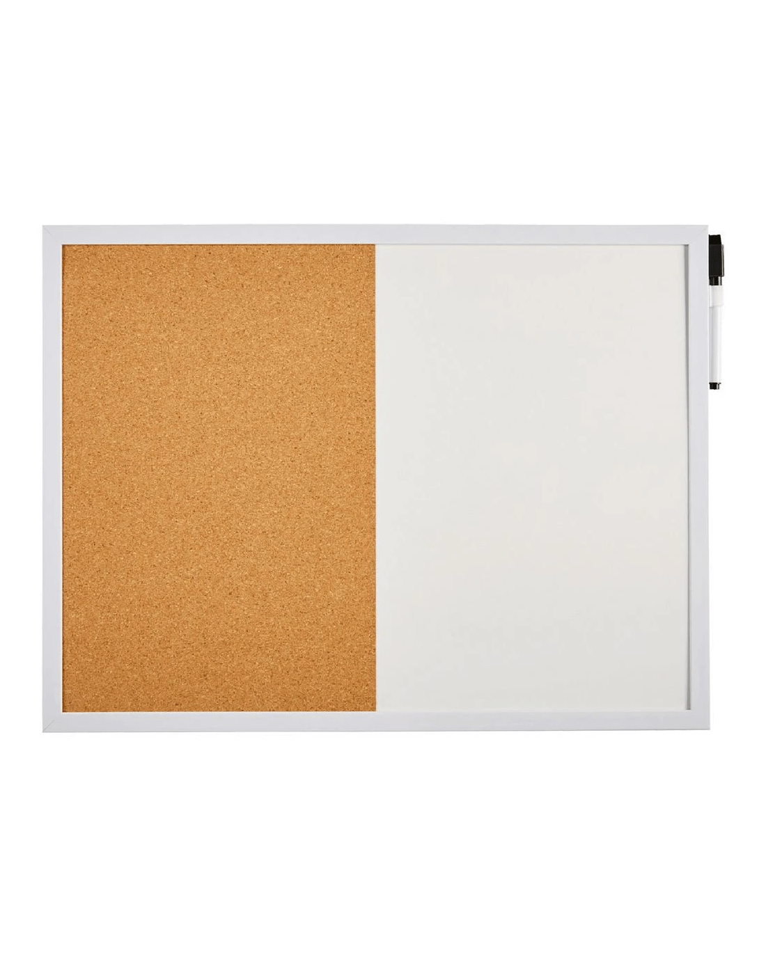 - The board has a magnetic whiteboard and corkboard surface and white plastic frame.