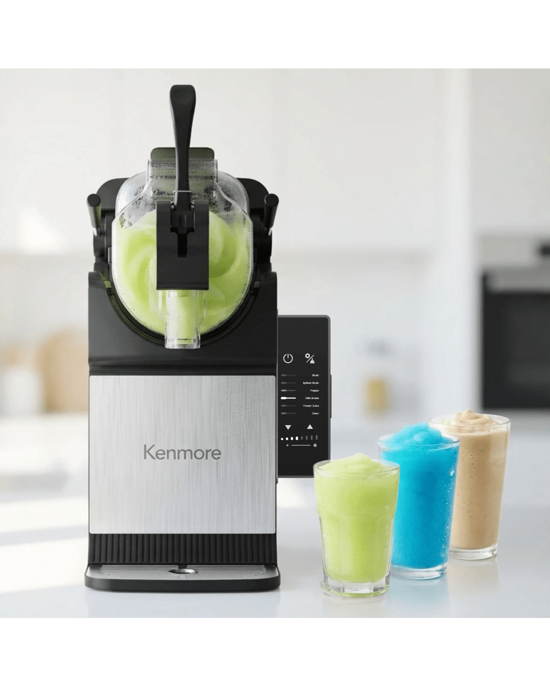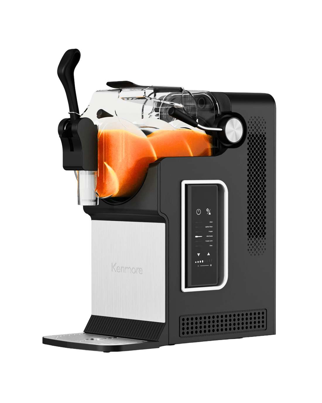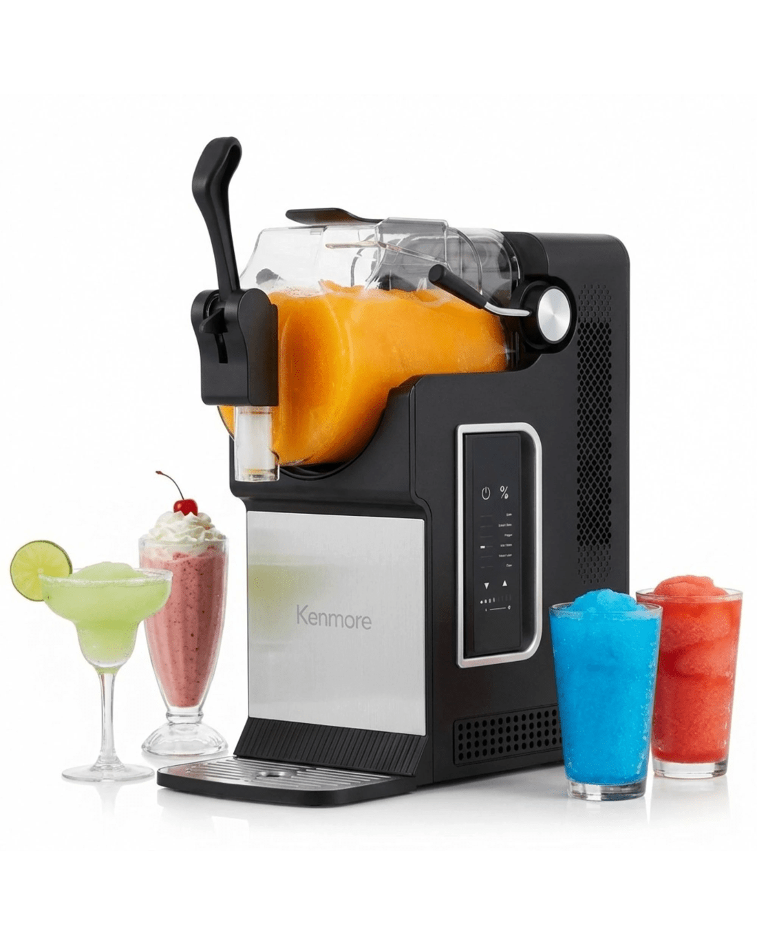 Enjoy frozen drinks at home without ice or dilution. This Kenmore slushie and frozen drink machine uses built-in compressor cooling to quickly freeze beverages into smooth, consistent slush in as little as 15 minutes. Five preset drink modes make it easy to prepare slushies, frappes, spiked slush drinks, milkshakes, and chilled juices, while adjustable thickness controls allow customization for different recipes and preferences. The large 71 oz capacity is ideal for entertaining, serving multiple drinks in a single batch. A controlled pour spout and removable drip tray help minimize mess, and the one-touch self-cleaning function simplifies cleanup after use. Designed for reliable everyday performance, this countertop machine brings frozen drink convenience to parties, holidays, and family gatherings.