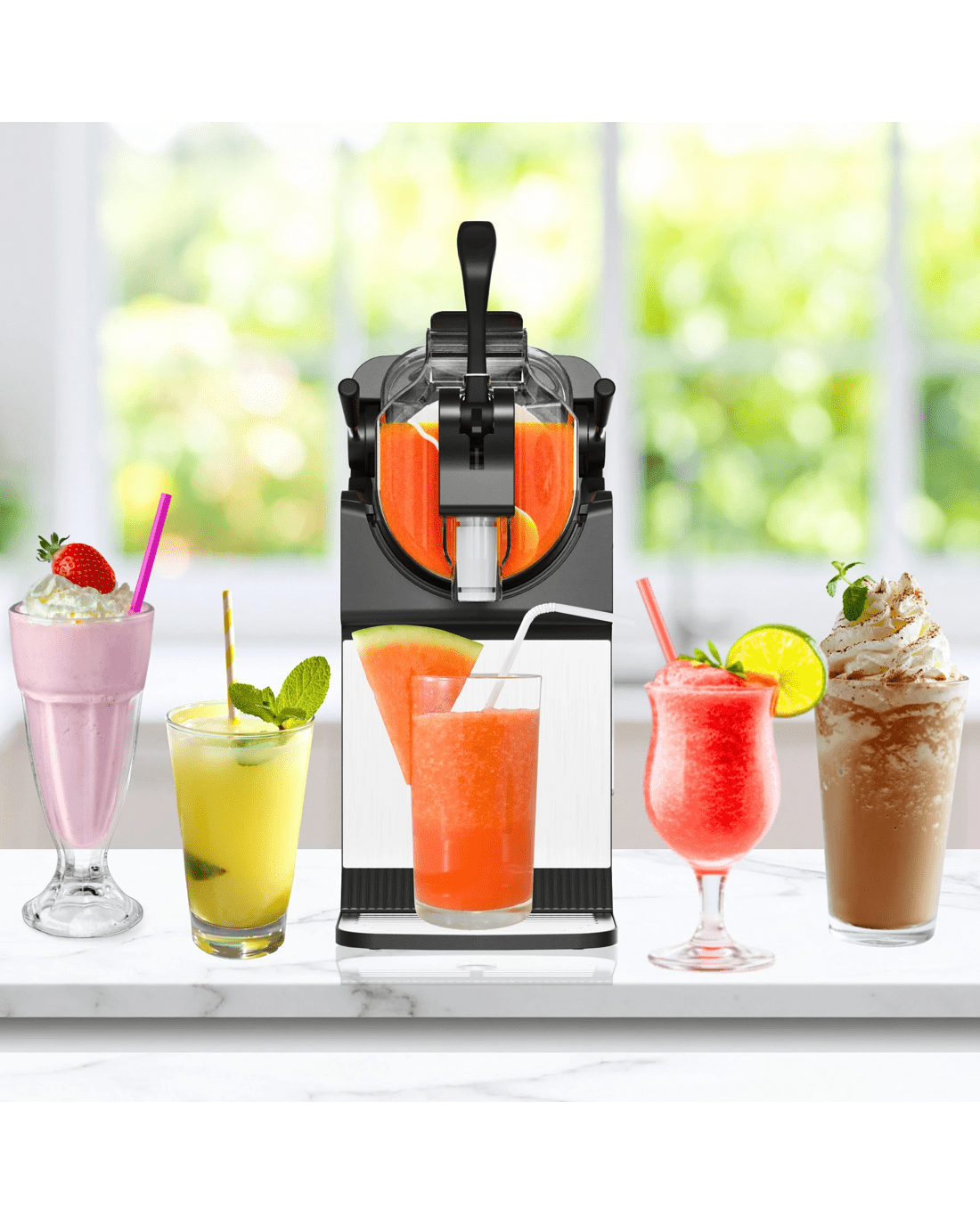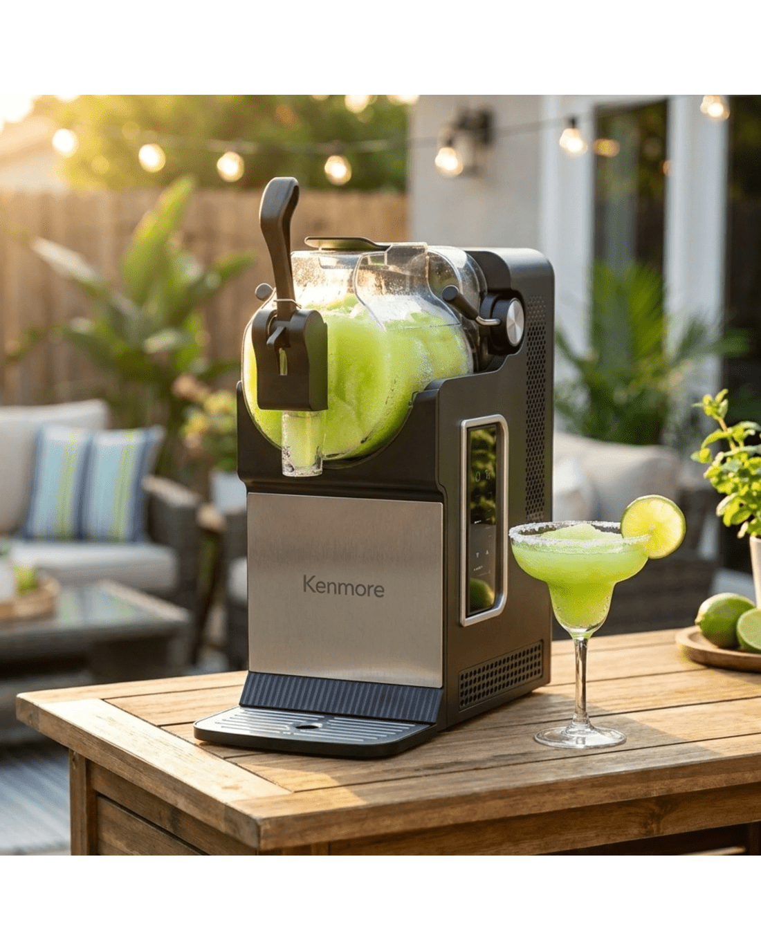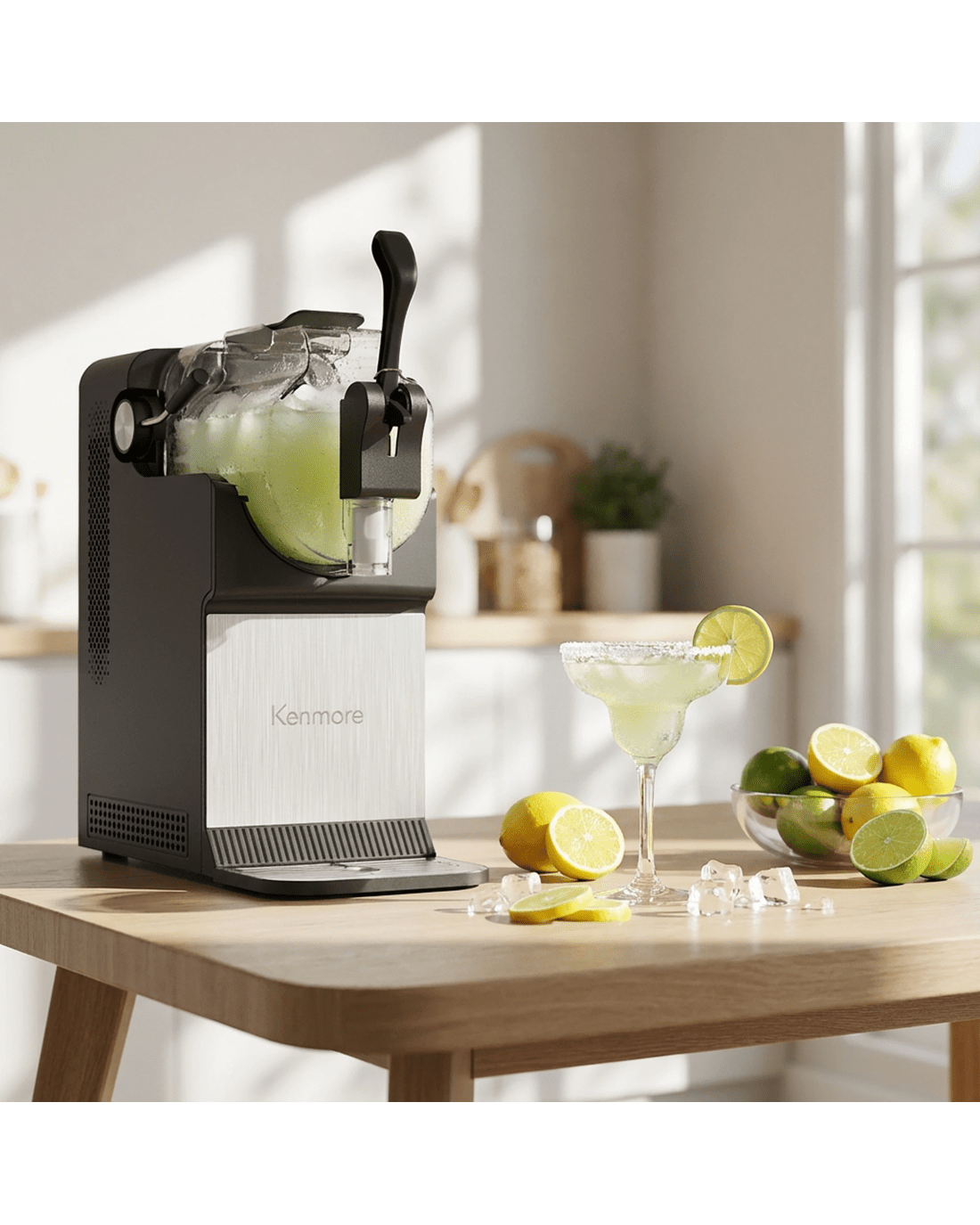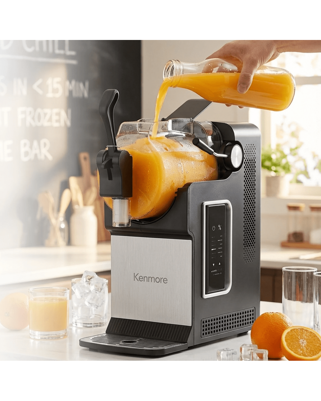 Enjoy frozen drinks at home without ice or dilution. This Kenmore slushie and frozen drink machine uses built-in compressor cooling to quickly freeze beverages into smooth, consistent slush in as little as 15 minutes. Five preset drink modes make it easy to prepare slushies, frappes, spiked slush drinks, milkshakes, and chilled juices, while adjustable thickness controls allow customization for different recipes and preferences. The large 71 oz capacity is ideal for entertaining, serving multiple drinks in a single batch. A controlled pour spout and removable drip tray help minimize mess, and the one-touch self-cleaning function simplifies cleanup after use. Designed for reliable everyday performance, this countertop machine brings frozen drink convenience to parties, holidays, and family gatherings.