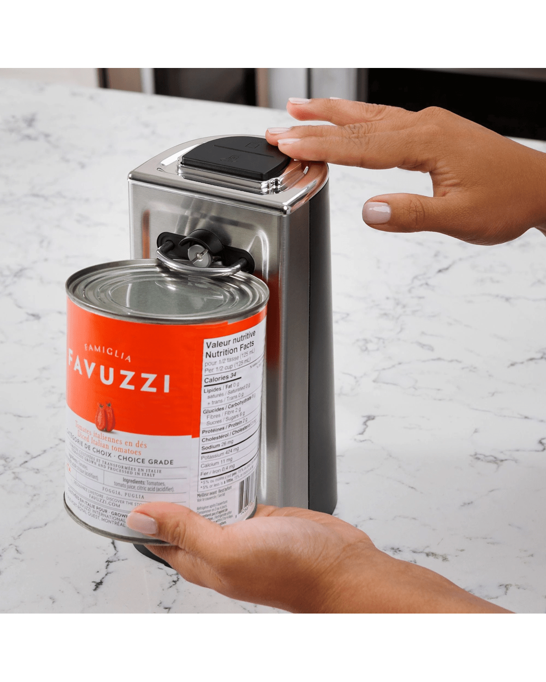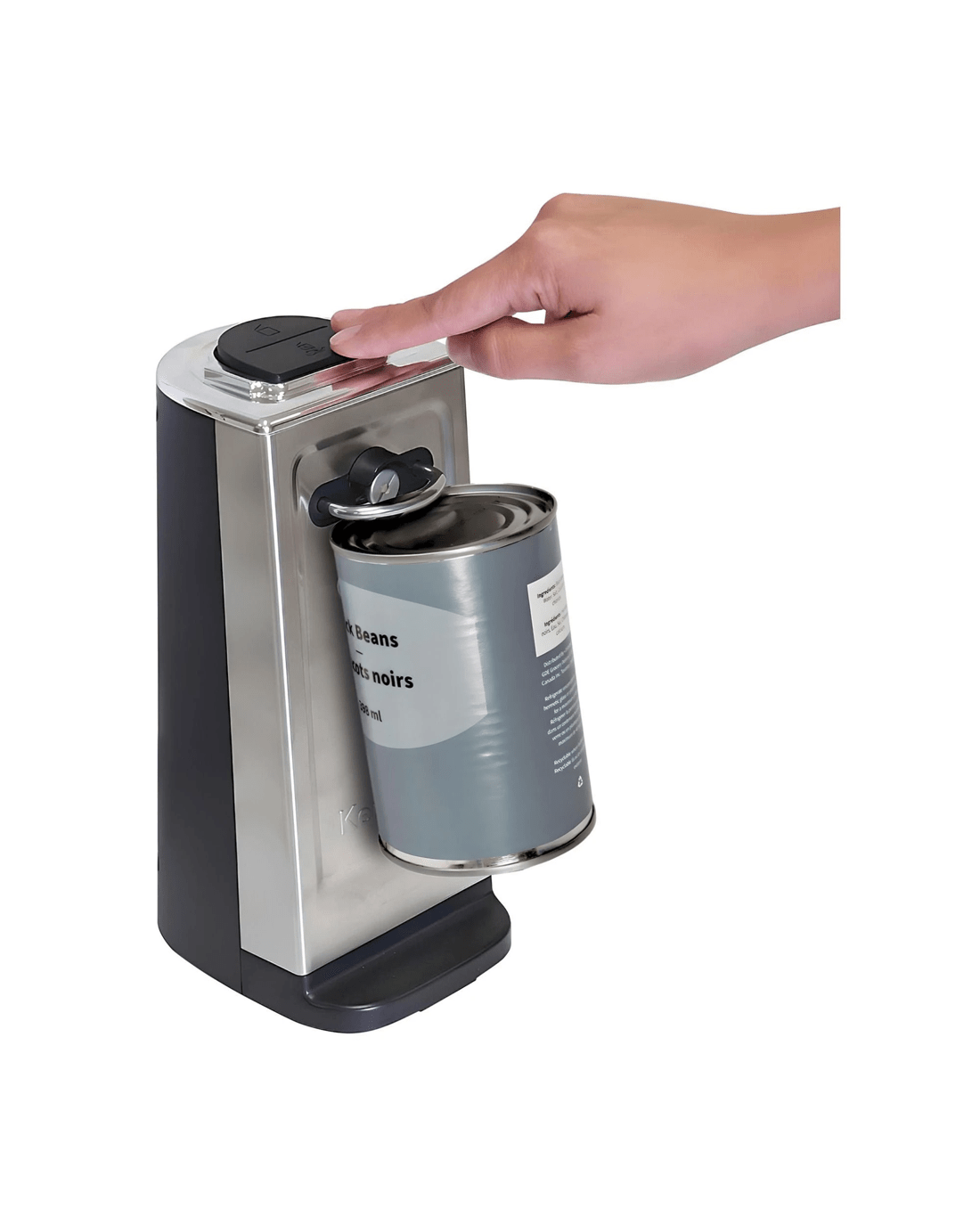 With its ergonomic design, safe and hygienic edge-cut blade, and hands-free opening and can release at the touch of a button, this innovative can opener is a kitchen essential for busy families, seniors, and anyone with arthritis or mobility issues. Extra-tall design lets you open cans of all sizes - even pop-top cans - nearly effortlessly. New side-cutting technology leaves the rim attached to eliminate dangerous sharp edges on both the can and lid and prevent the lid from falling into your food. Featuring a durable black and stainless steel finish and a stabilizing wide, non-slip base, this easy-to-use can opener delivers both safety and style in one convenient package. This product features an Australian rated plug. It is compatible with 220-240 VAC.