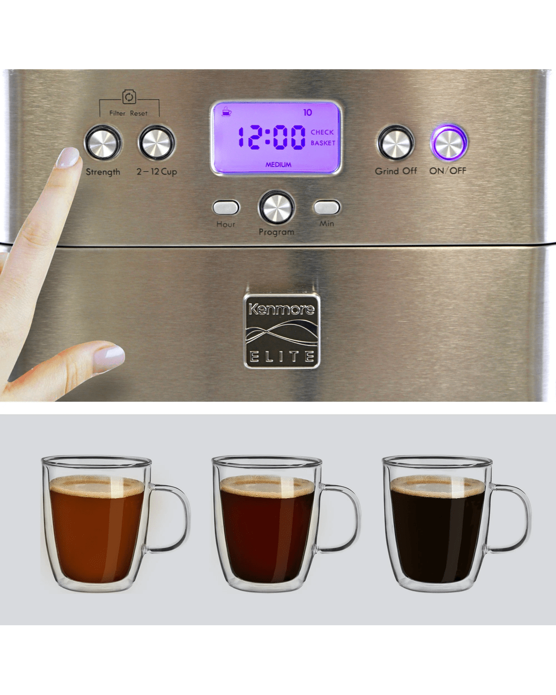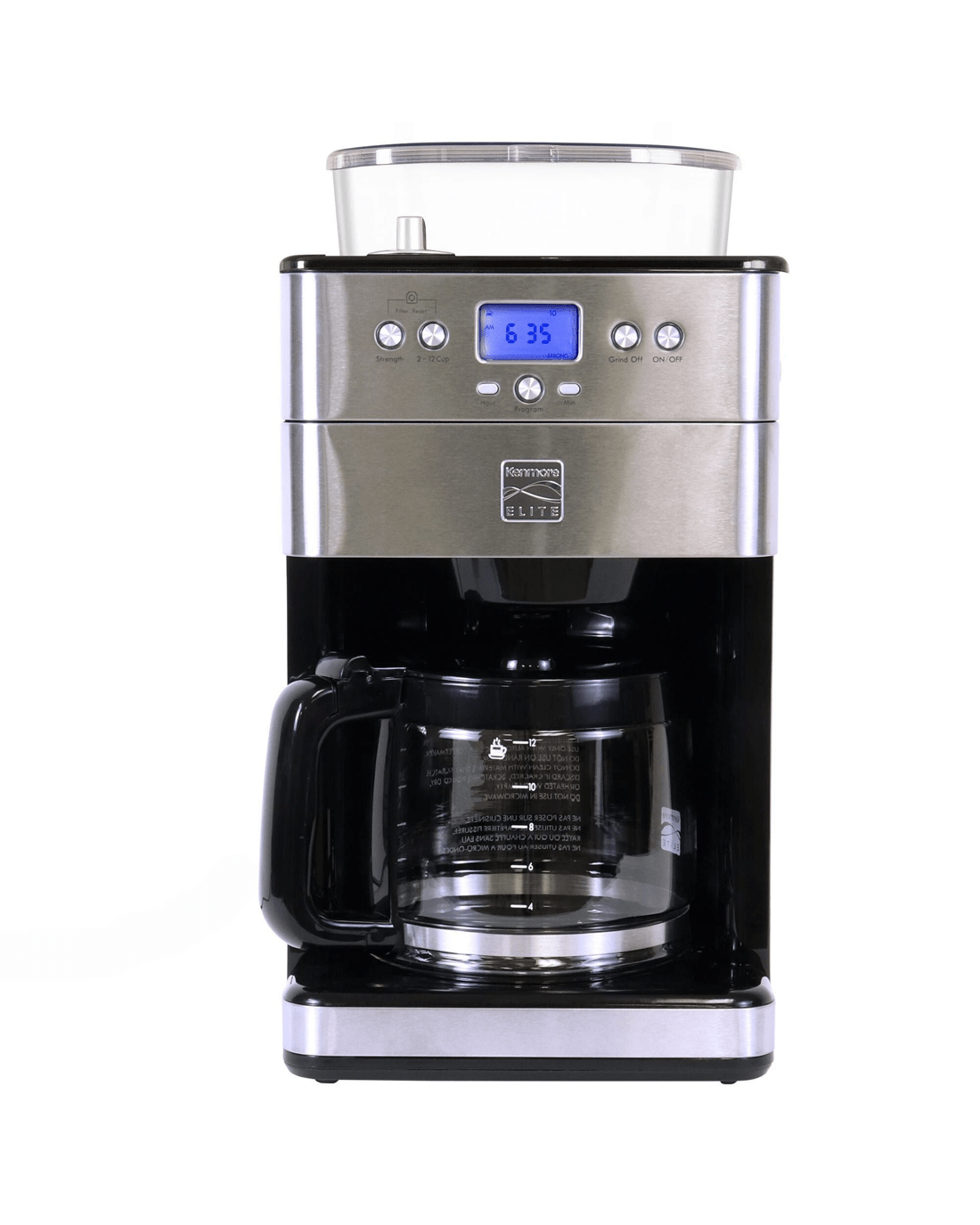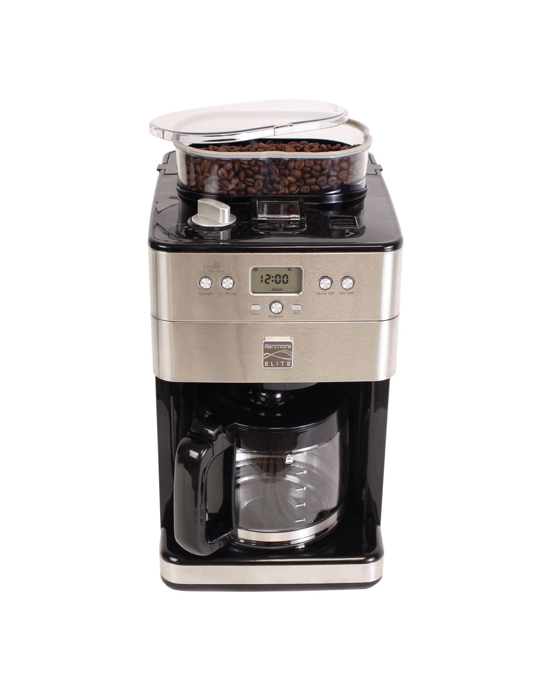 Freshness is key when it comes to rich, flavorful coffee: The Kenmore Elite Grind and Brew Coffee Maker's built-in conical burr grinder grinds fresh, whole coffee beans straight from the air-tight bean hopper immediately before brewing to release their full array of flavors and aromas. Simple digital controls let you program the timer for automatic brewing, customize the strength of your brew to Mild, Medium or Strong to suit your personal taste, and select the amount to brew from 2 to 12 cups with no waste. The "Grind Off" feature lets you bypass the grinder to brew from pre-ground coffee as needed and the grind size selector has 9 options from "Fine" to "Coarse." Your Grind and Brew also includes a measuring scoop, cleaning brush, washable reusable coffee filter, and replaceable charcoal water filter, and best of all, Kenmore Elite products are backed by a 5-year limited warranty for your peace of mind.