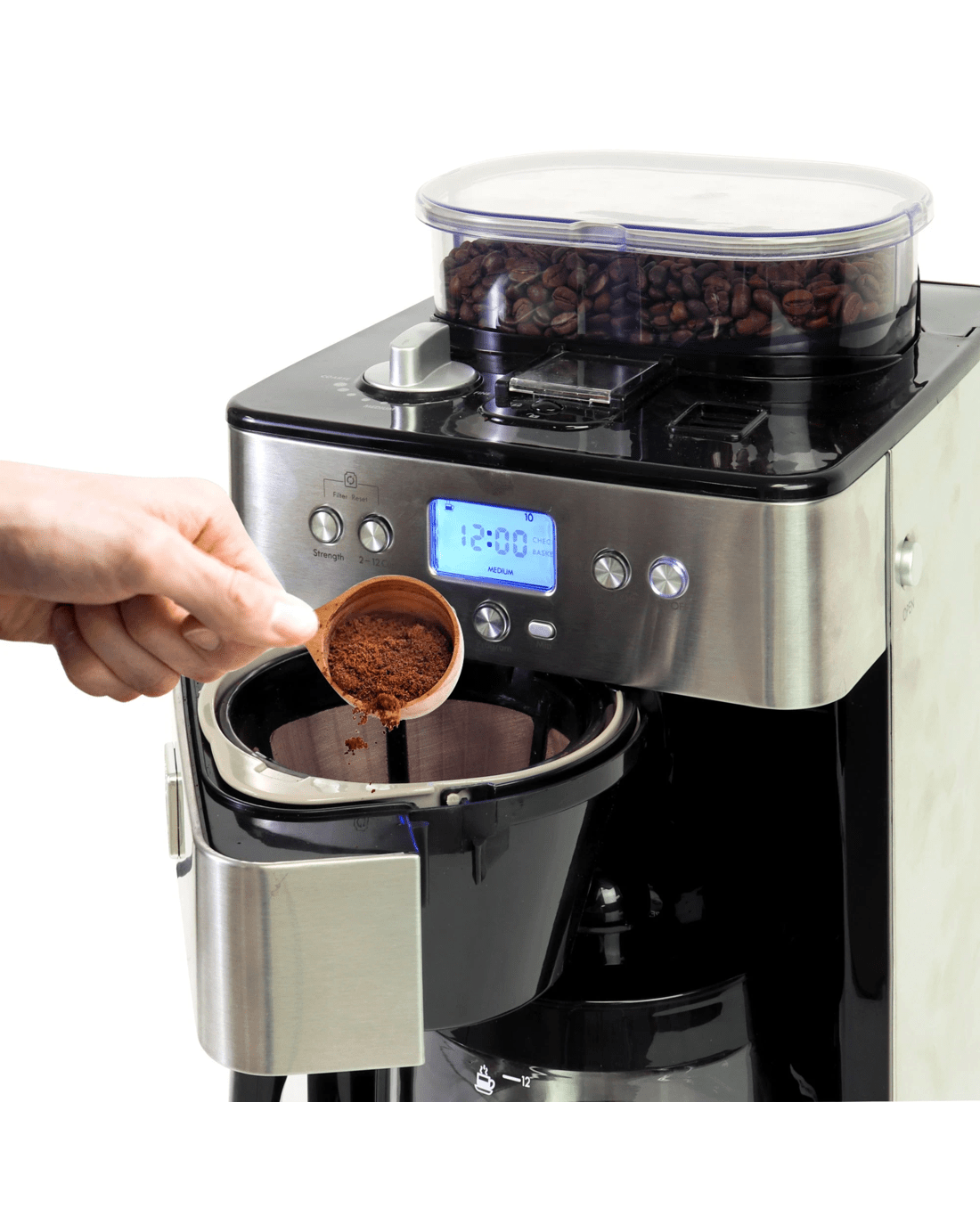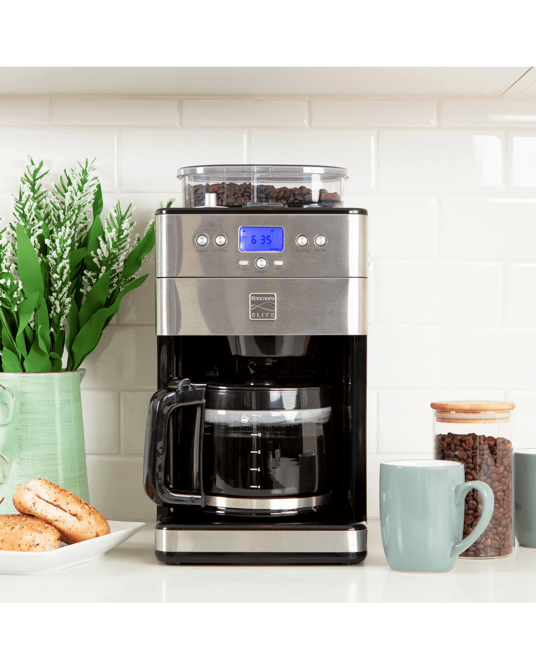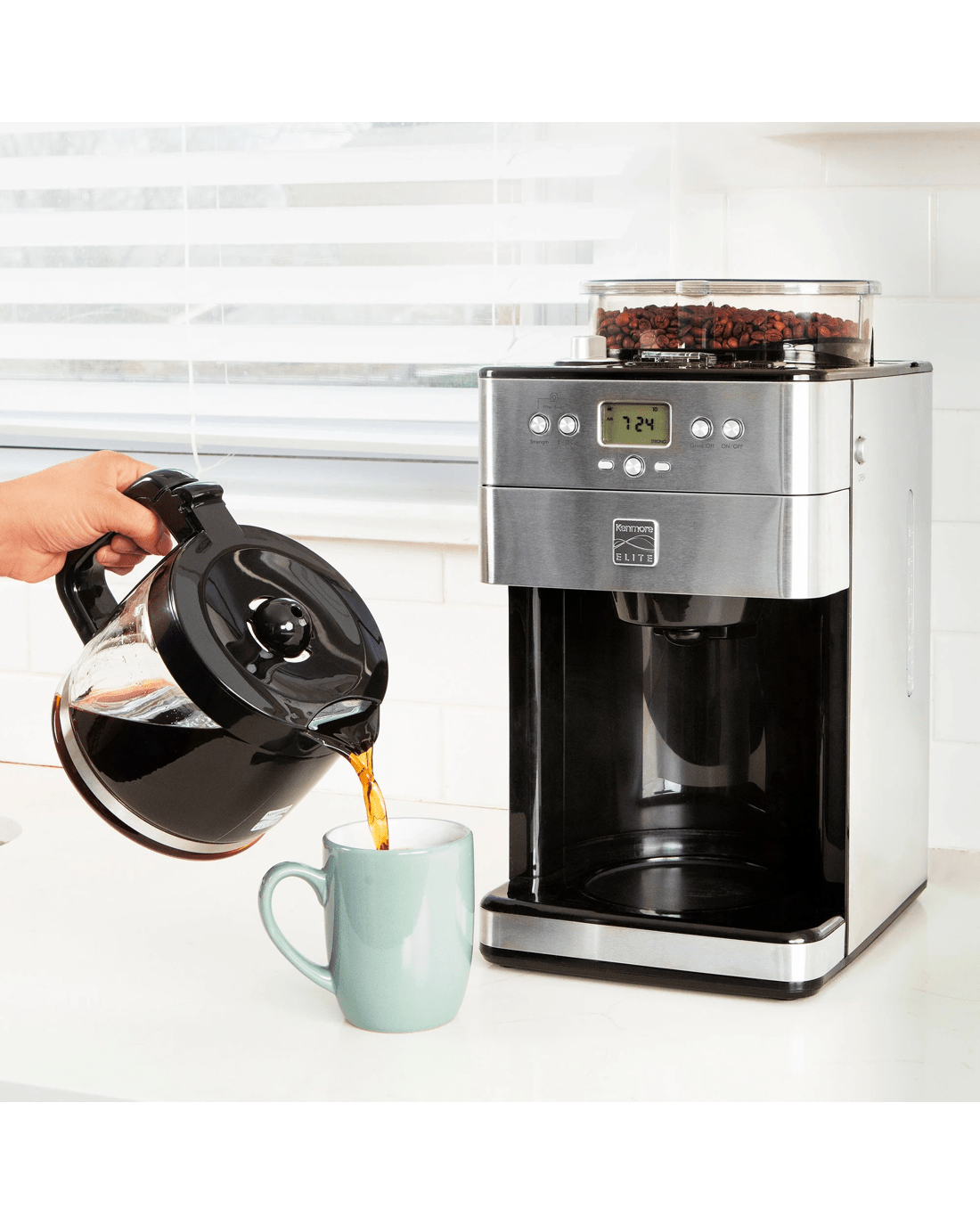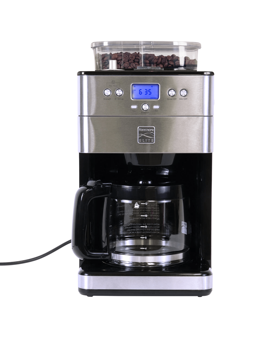 Freshness is key when it comes to rich, flavorful coffee: The Kenmore Elite Grind and Brew Coffee Maker's built-in conical burr grinder grinds fresh, whole coffee beans straight from the air-tight bean hopper immediately before brewing to release their full array of flavors and aromas. Simple digital controls let you program the timer for automatic brewing, customize the strength of your brew to Mild, Medium or Strong to suit your personal taste, and select the amount to brew from 2 to 12 cups with no waste. The "Grind Off" feature lets you bypass the grinder to brew from pre-ground coffee as needed and the grind size selector has 9 options from "Fine" to "Coarse." Your Grind and Brew also includes a measuring scoop, cleaning brush, washable reusable coffee filter, and replaceable charcoal water filter, and best of all, Kenmore Elite products are backed by a 5-year limited warranty for your peace of mind.