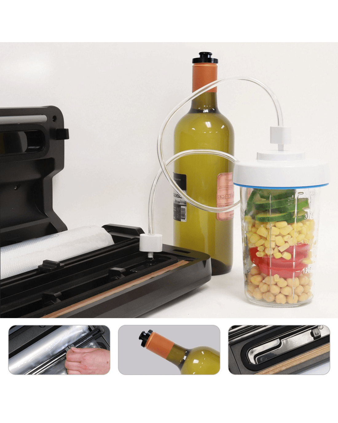 Save space, reduce waste, and keep your food fresh for longer! Vacuum sealing saves space and keeps food fresh up to 5 times longer than conventional storage methods, and kenmore food preservation system has everything you need to get started right out of the box. Your starter kit includes 1 bag roll (28 x 500 cm), 5 small bags (12 x 20 cm), 5 medium bags (20 x 25 cm), external hose, and bottle stopper. Digital touch controls with led indicators make it easy to choose from 7 pre-set functions (normal, gentle, dry, moist, pulse, seal, and canister) to suit the task at hand, and the built-in cutting bar lets you customize perfectly sized bags with no wasted plastic. And the possibilities don't end with food - the versatile vacuum sealer machine can also protect valuable keepsakes and documents from oxidation, corrosion, and moisture, and the universal hose connector can be used with most available vacuum seal containers, canisters, and mason jar sealer kits (sold separately). This product features an Australian rated plug. It is compatible with 220-240 VAC.