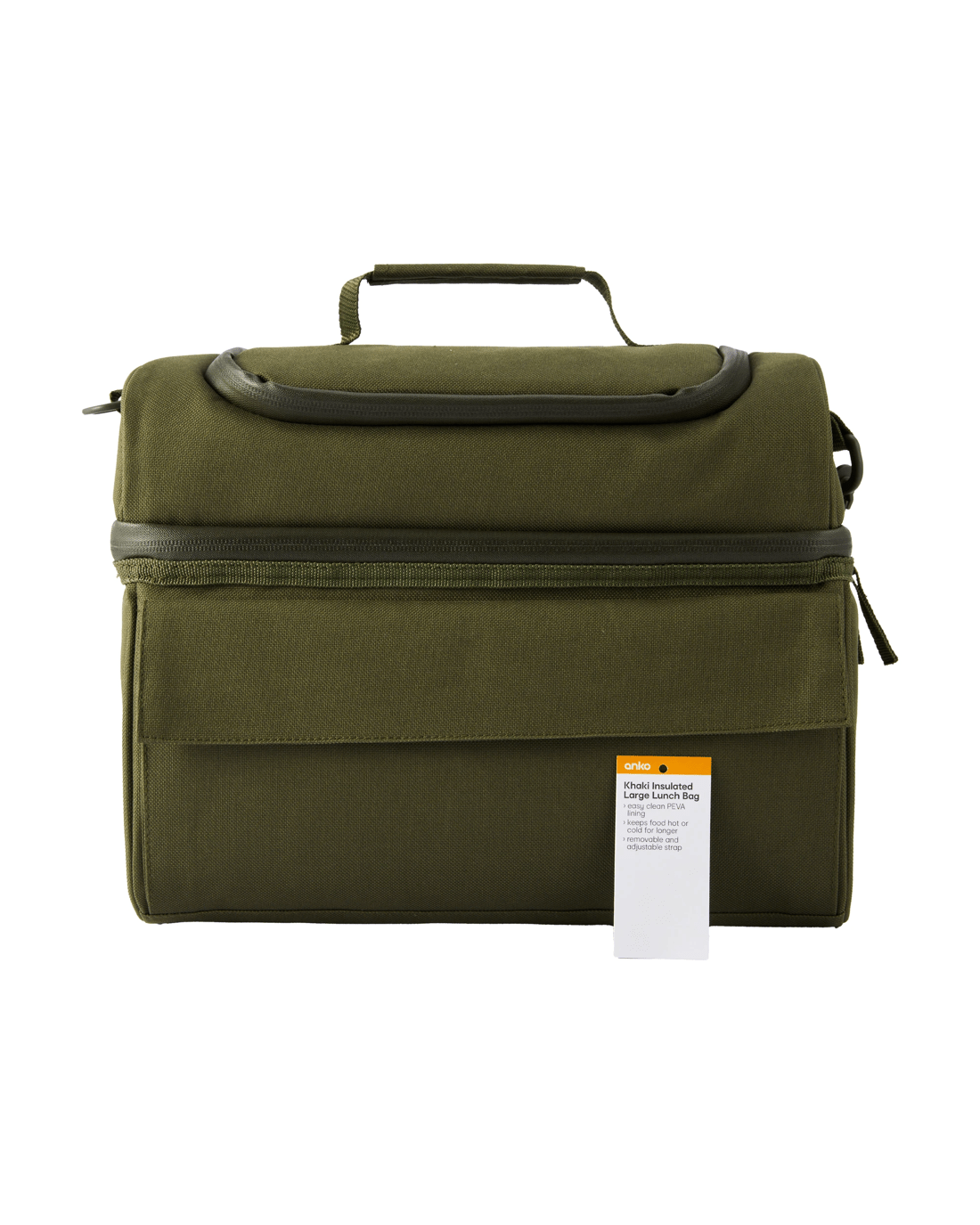 This Khaki Insulated Large Lunch Bag features a spacious interior with insulation to keep food warm or cool. Its simple design includes a carry handle and a secure zipper, making it suitable for carrying lunch to work, school, or on the go.