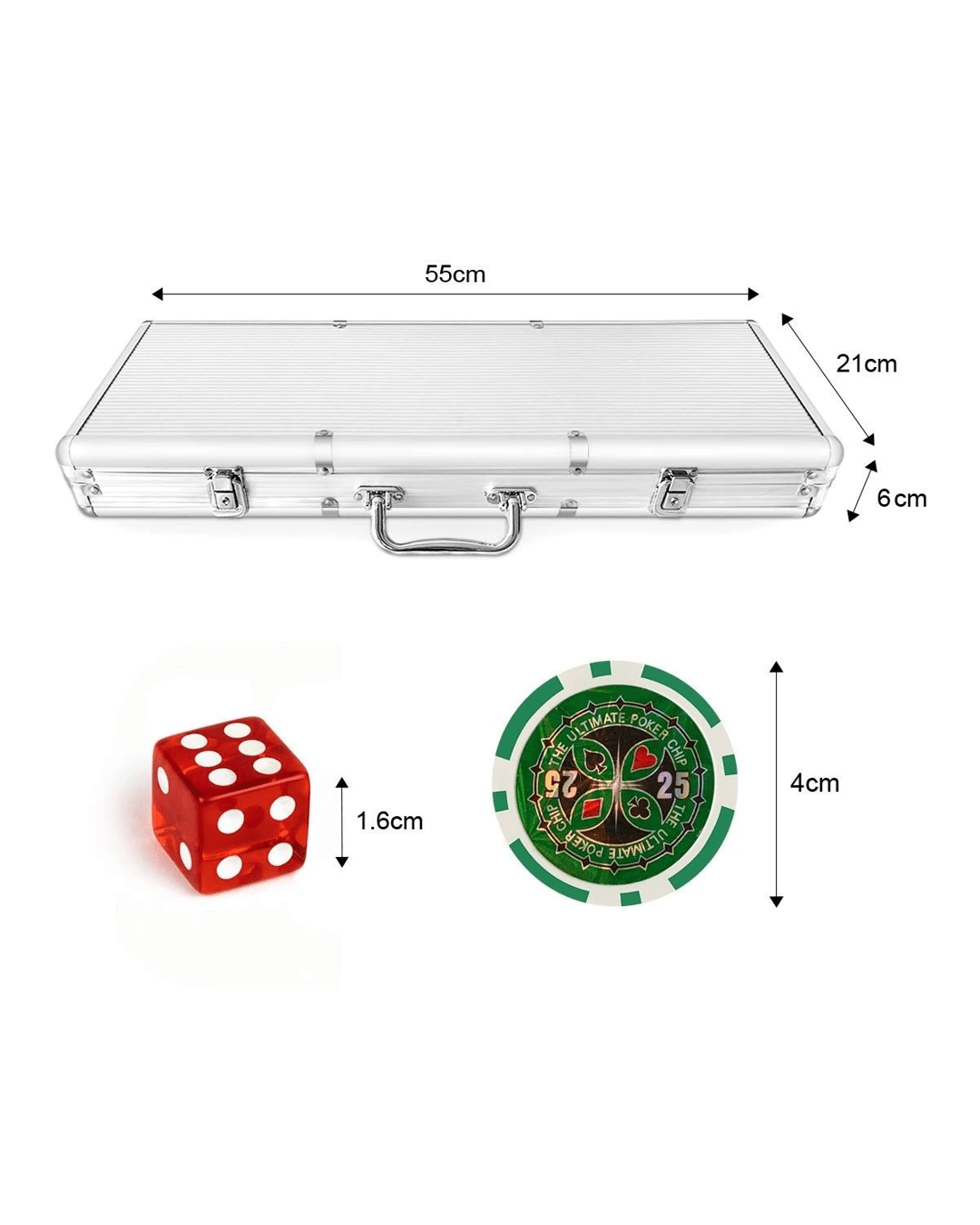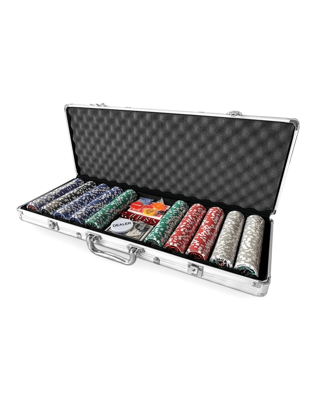 Hold a fantastic poker game and step up your betting strategy with our professional poker chip set. The poker set strikes with 500 poker chips which have clear and useful denominations in six different colours, allowing you to engage in a variety of tournament poker games efficiently. The professional poker chips, 2 decks of playing cards, 5 casino style dices, 1 dealer button, and 5 poker buttons, all of these pieces packed in a silver aluminium carrying case with safe locking system for convenient storage and transport. Each chip is made from clay composite material with metal core and has an excellent weight of 11.5 gram, making it easier enough to stack and shuffle for every gambling session. Bring this poker chip set home letting your family and friends enjoy a real Texas Holdem poker game.