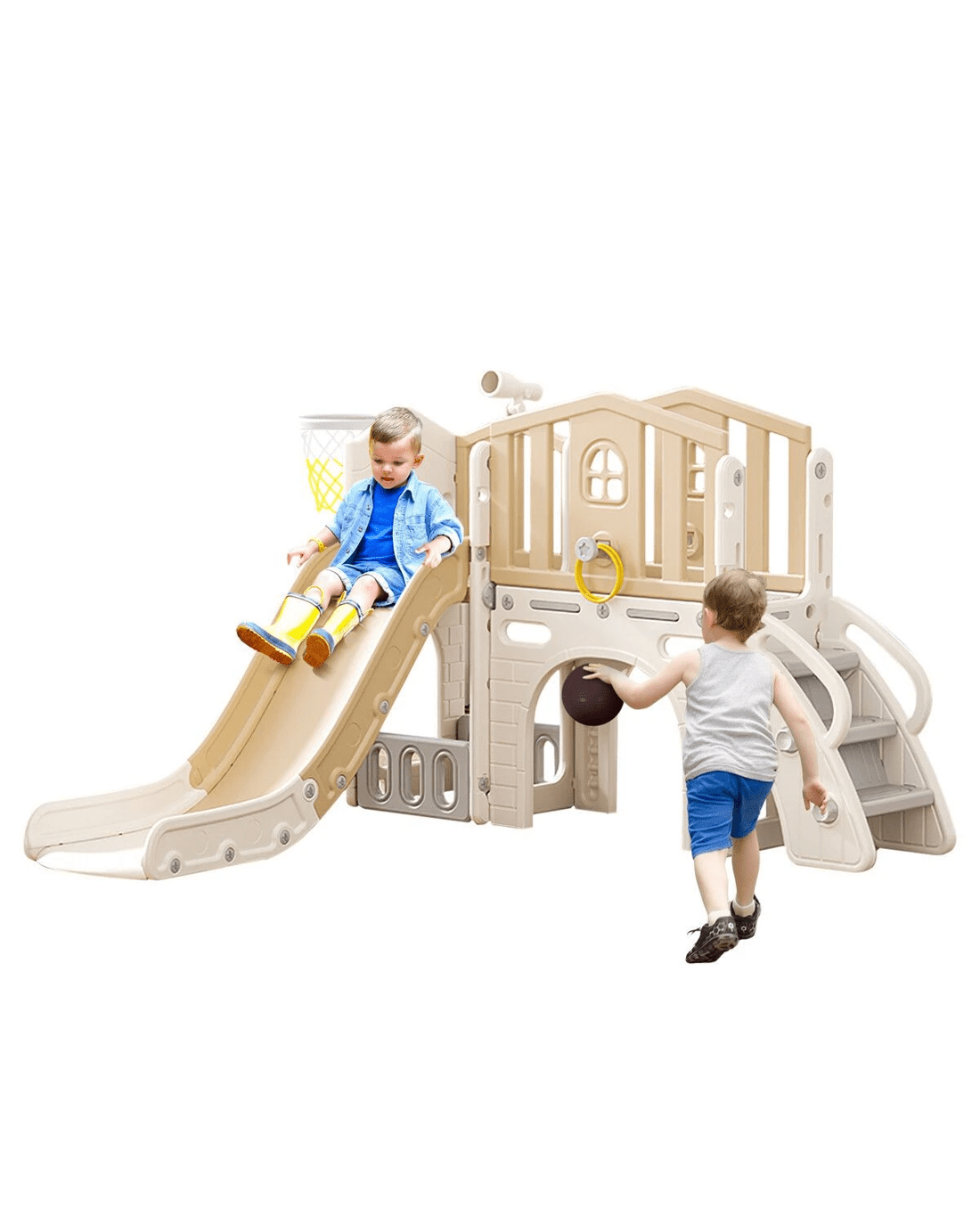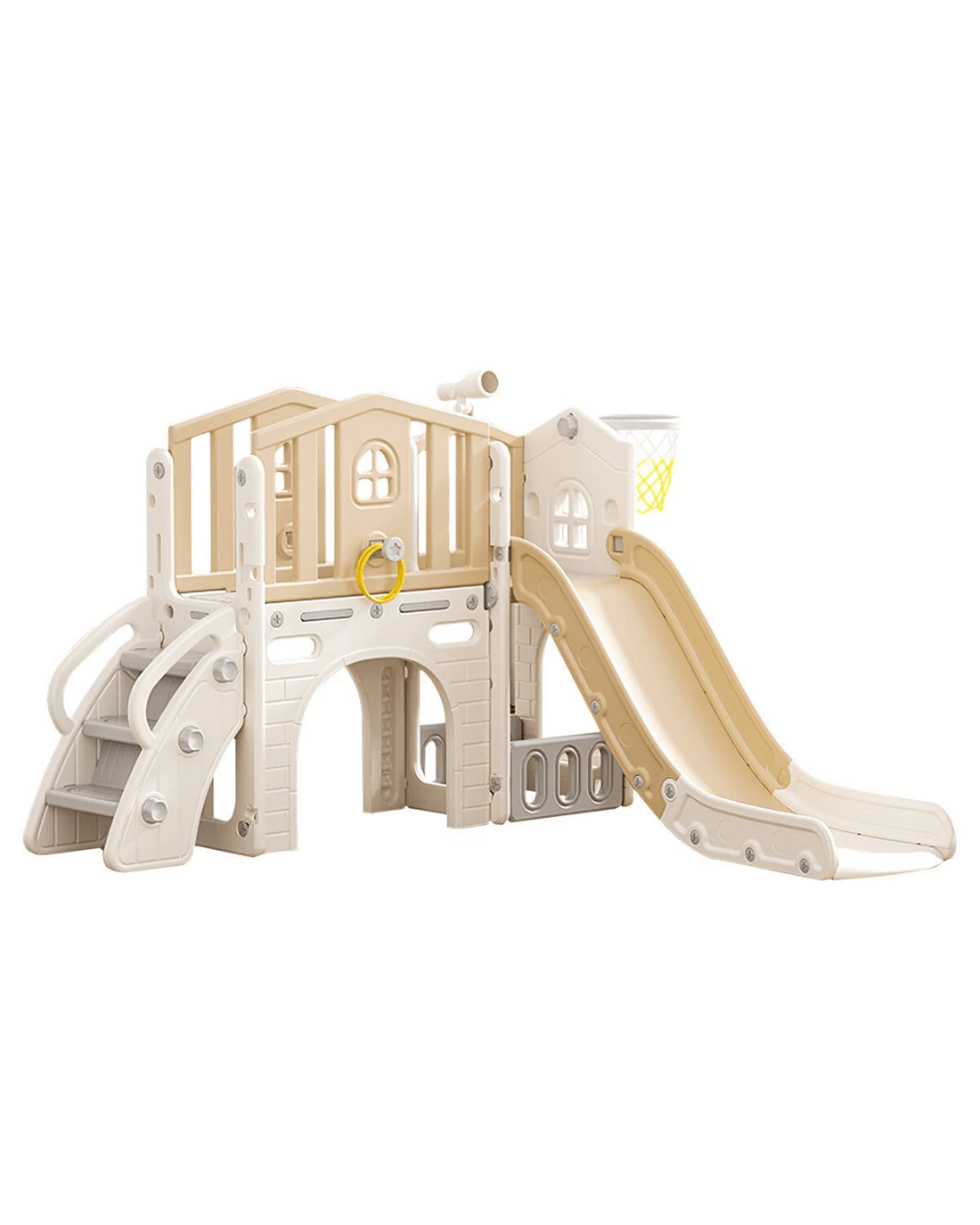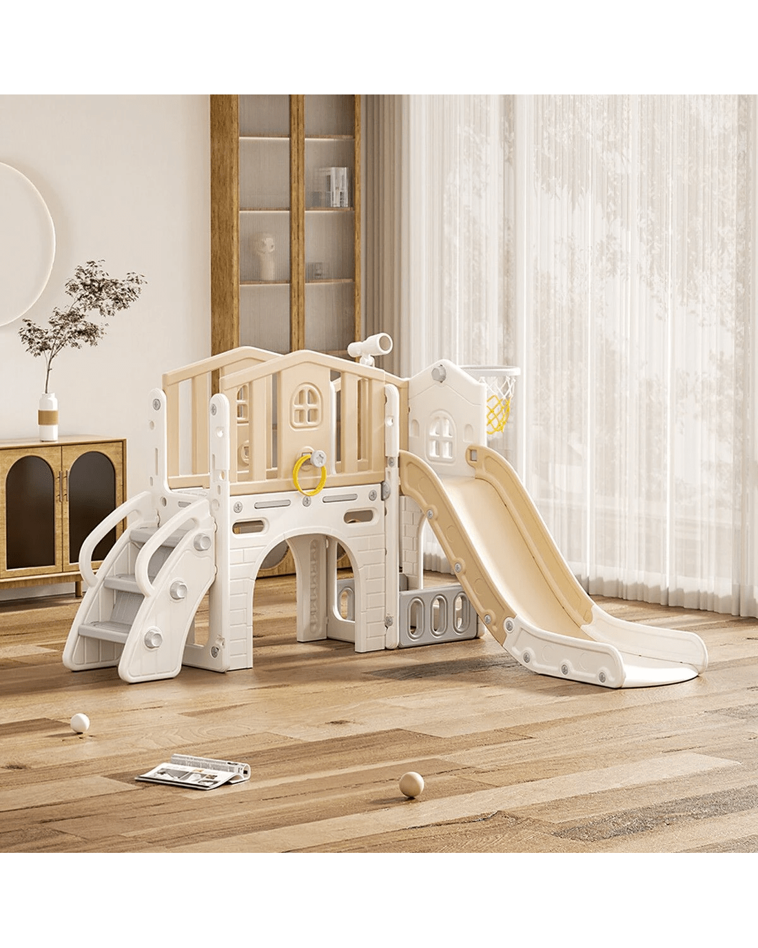 - 7-in-1 Activity Centre: The baby slide incorporates 7 activity areas, including the climber, slide, basketball hoop, ring toss, telescope, storage space, and tunnel. These activities promote coordination, adventure, and various forms of play for children.