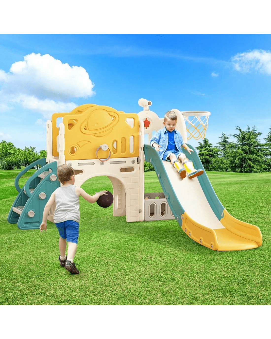 - 7-in-1 Activity Centre: Includes climber, slide, basketball hoop, ring toss, telescope, storage space, and tunnel, enhancing coordination and play.