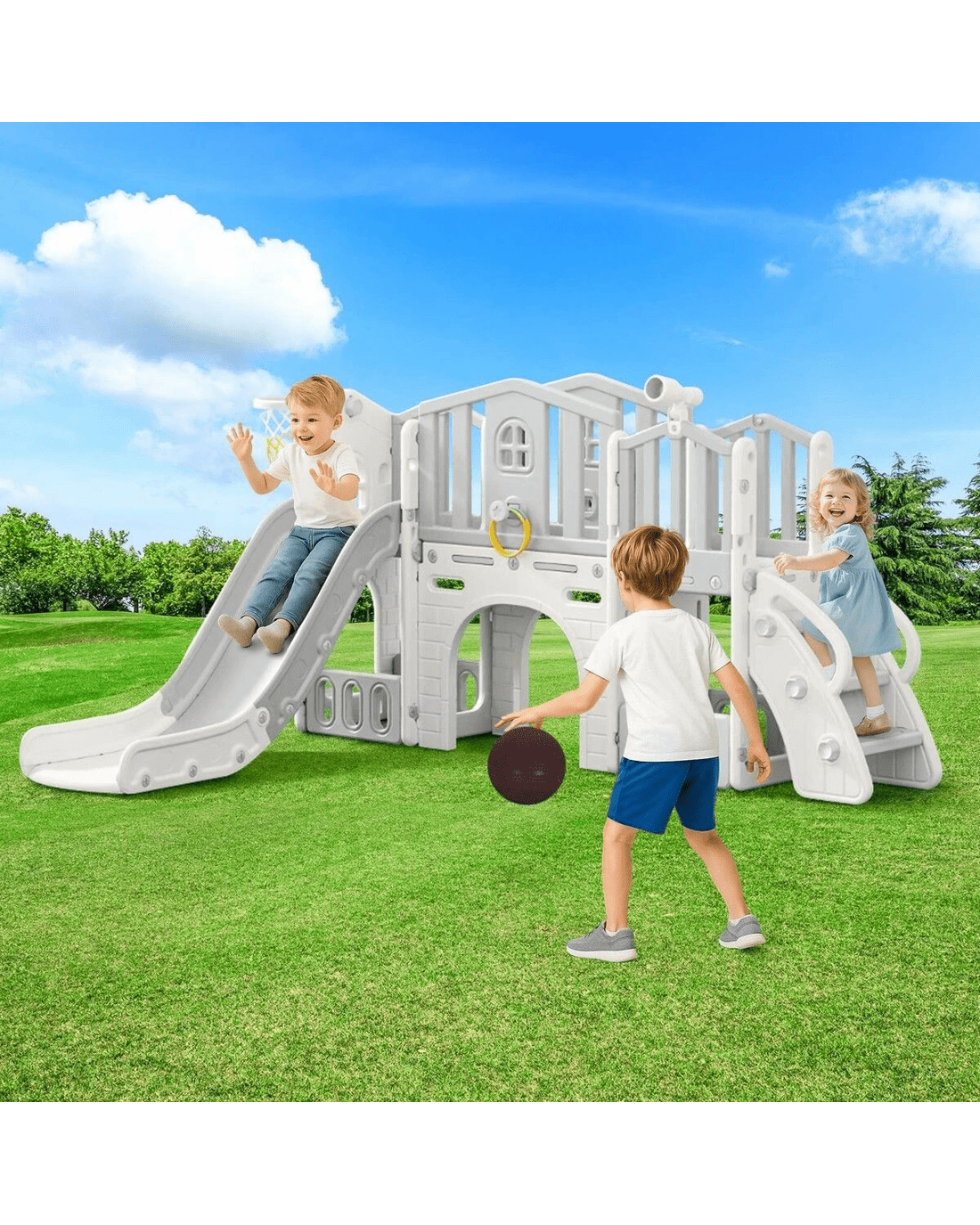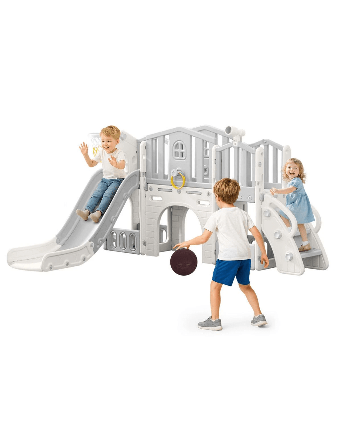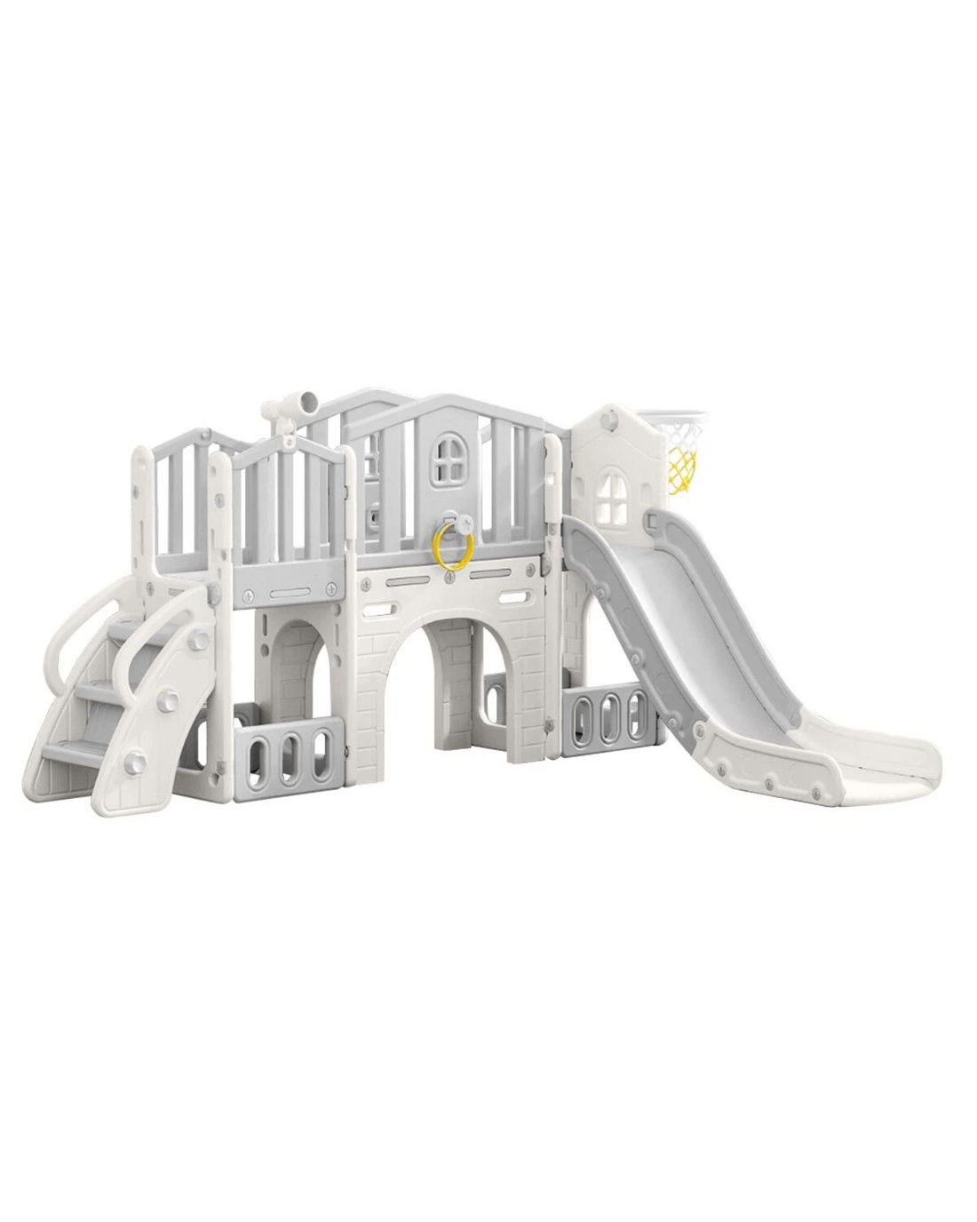 - 8-in-1 Activity Centre: Includes climber, slide, basketball hoop, ring toss, telescope, storage space, and tunnel, enhancing coordination and play.