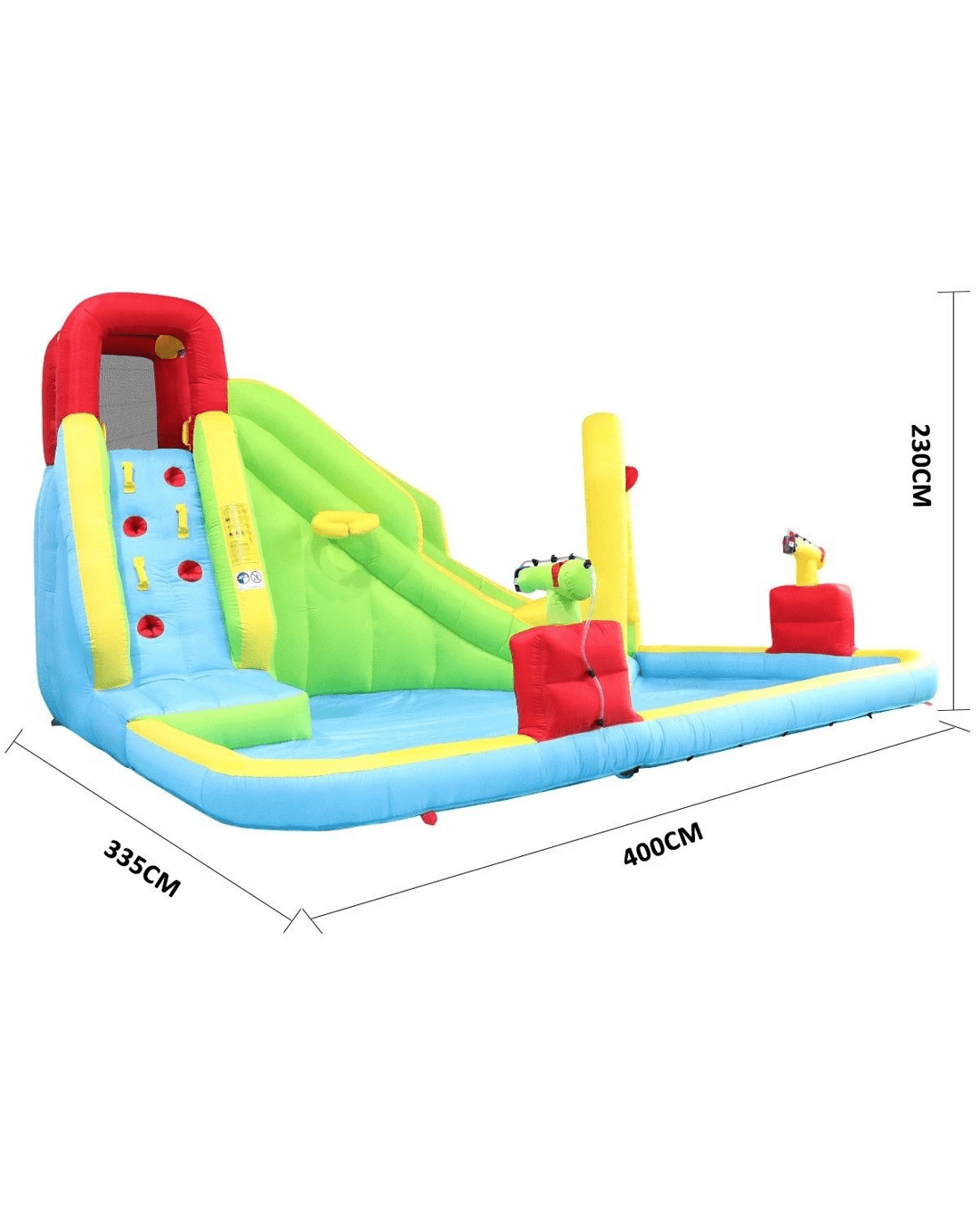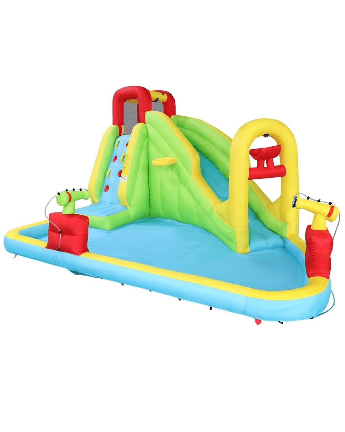 - Multiple playing areas: a huge splash pool, a water slide with tunnel, a climbing wall, two cannons, a castle, a basketball and basket ring