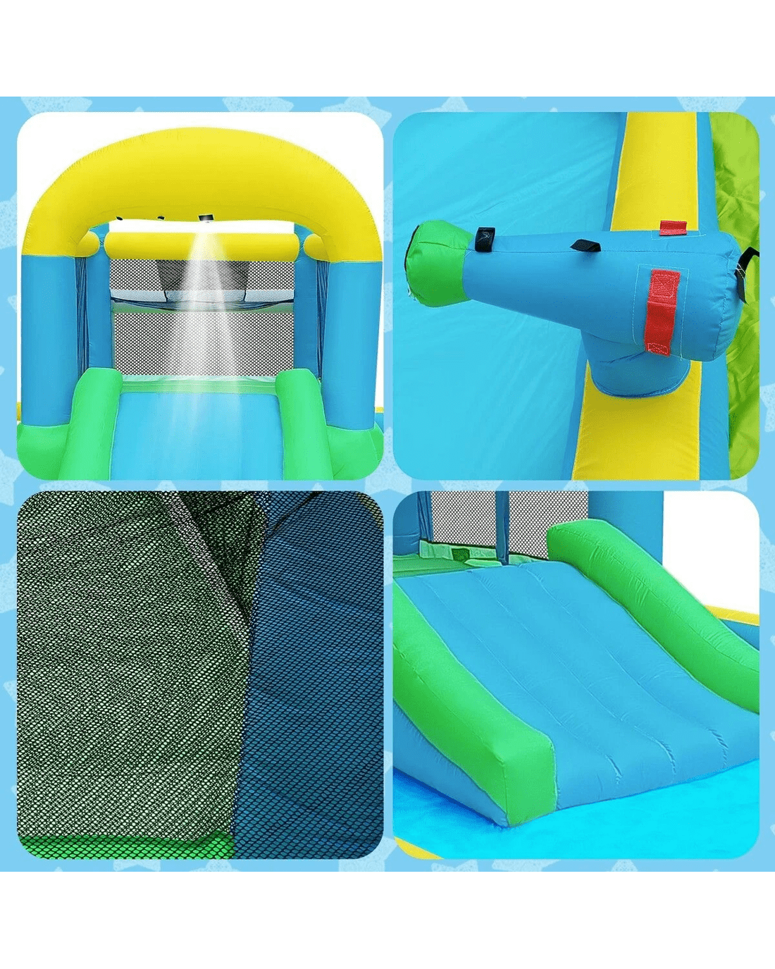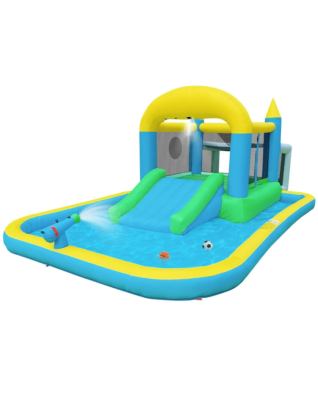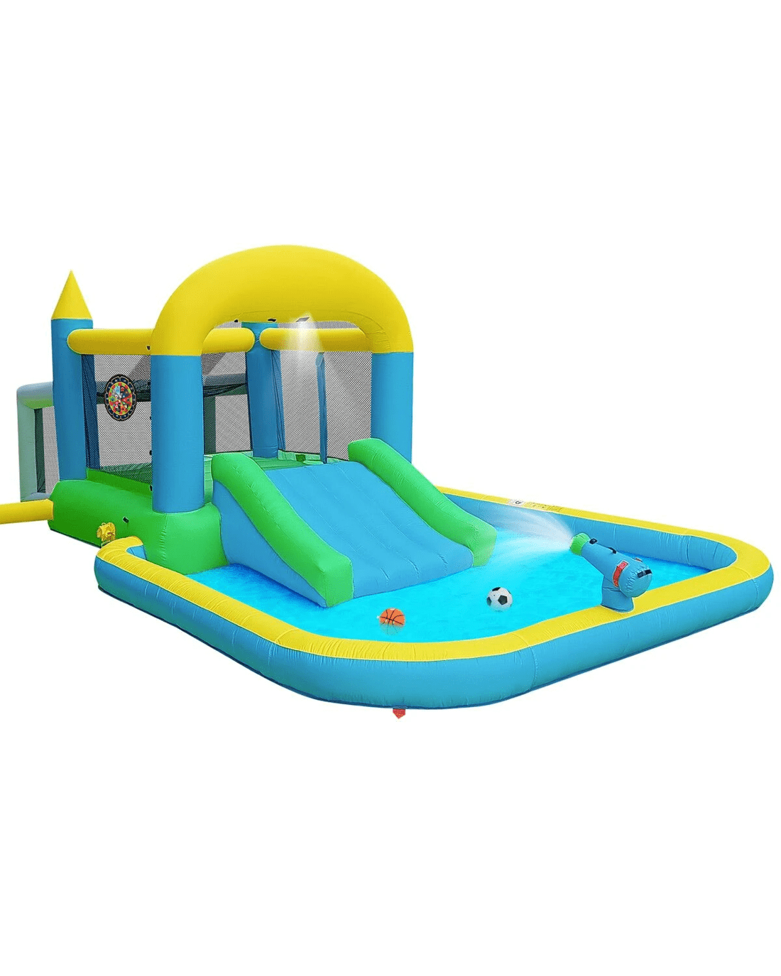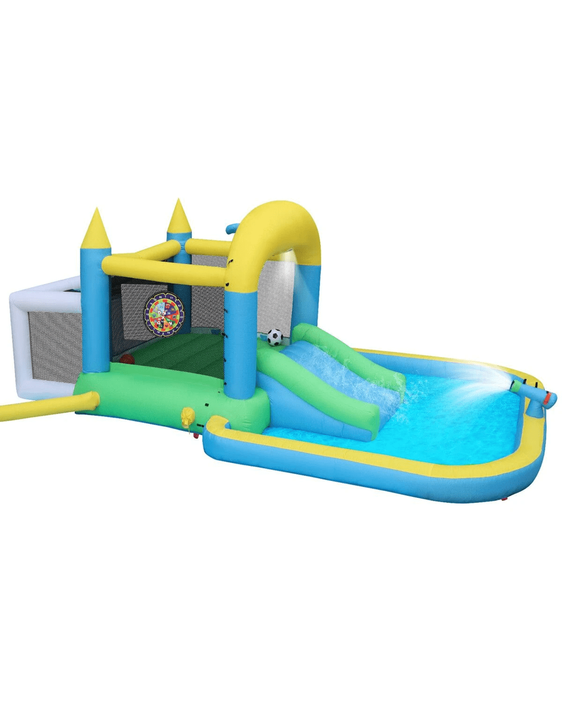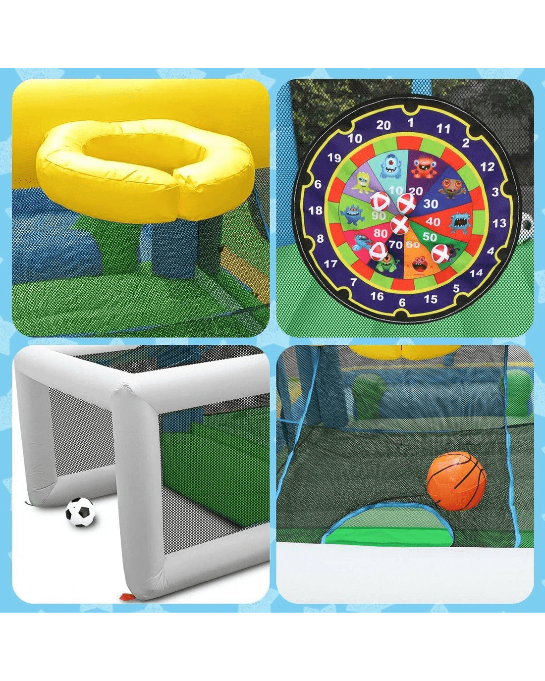 | Package Contents | 1 x inflatable bouncer 1 x blower motor 4 x blower stake 8 x bouncer stake 1 x carry bag 4 x repair patch 1 x hose assembly kit 1 x PVC basketball 6 x dart target ball 1 x football 1 x hand pump |