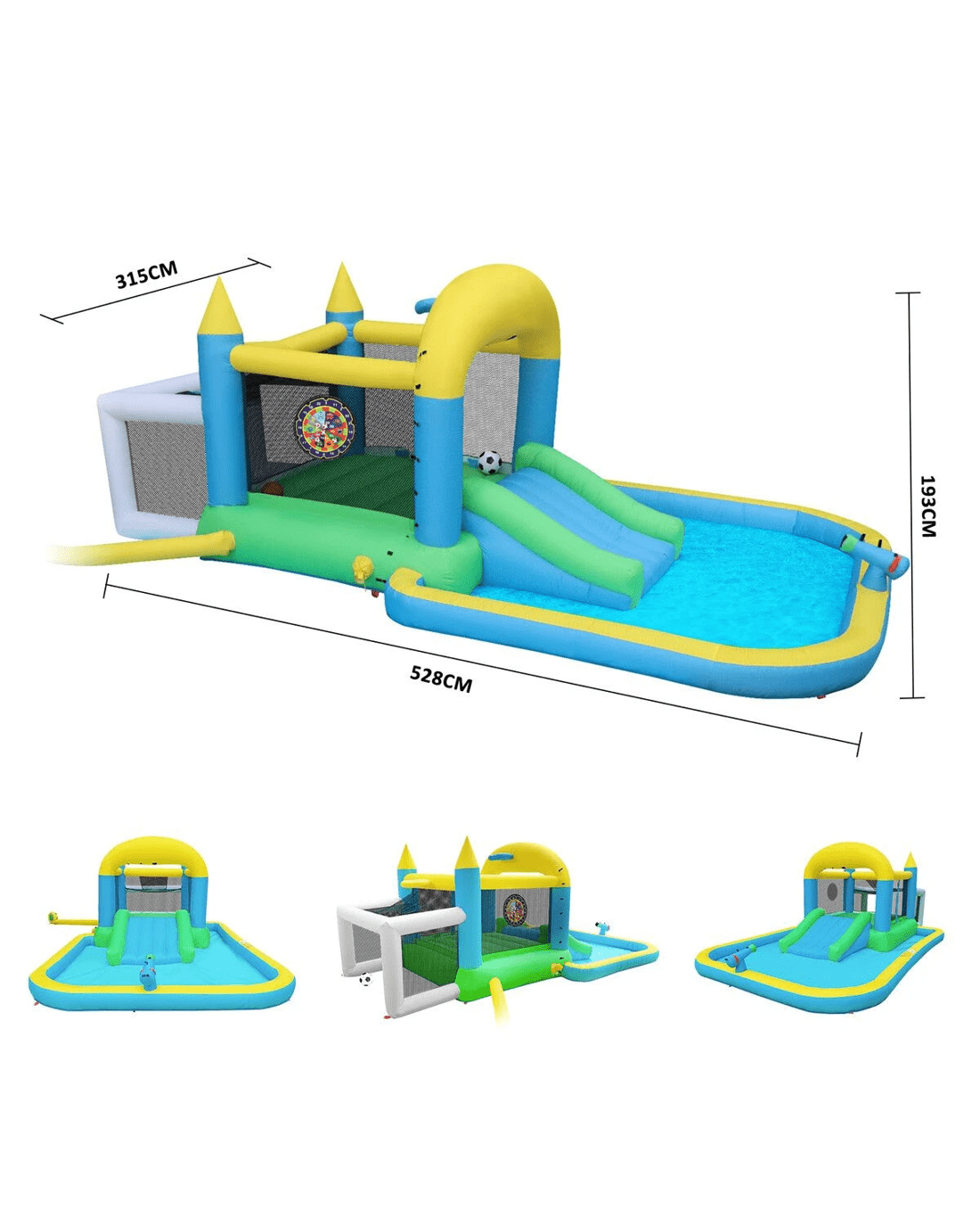 Offer your children a pleasant way of playing while staying cool in the hot summer with this Inflatable Water Park World Jumping Castle. Constructed of high-class Oxford fabric, the water world is durable, non-toxic, and odourless. With an overall size of 528x315x193cm, the water jumping castle is large enough for multiple kids to jump, run, and play with maximum safety. The entertainment can be enhanced with additional accessories like a water slide, a dart target set, a basketball ring, and a football system. For easy transport, the outdoor play kit includes a storage bag with high-quality straps. Available in a colourful look, this blow-up water park can trigger children's interest and help develop their motor skills, coordination, and interaction. WARNING! Children have drowned in portable swimming pools. Ensure active adult supervision at all times. Do not leave children unsupervised in or around the pool, and keep them within arm's reach. Empty and store safely after use.