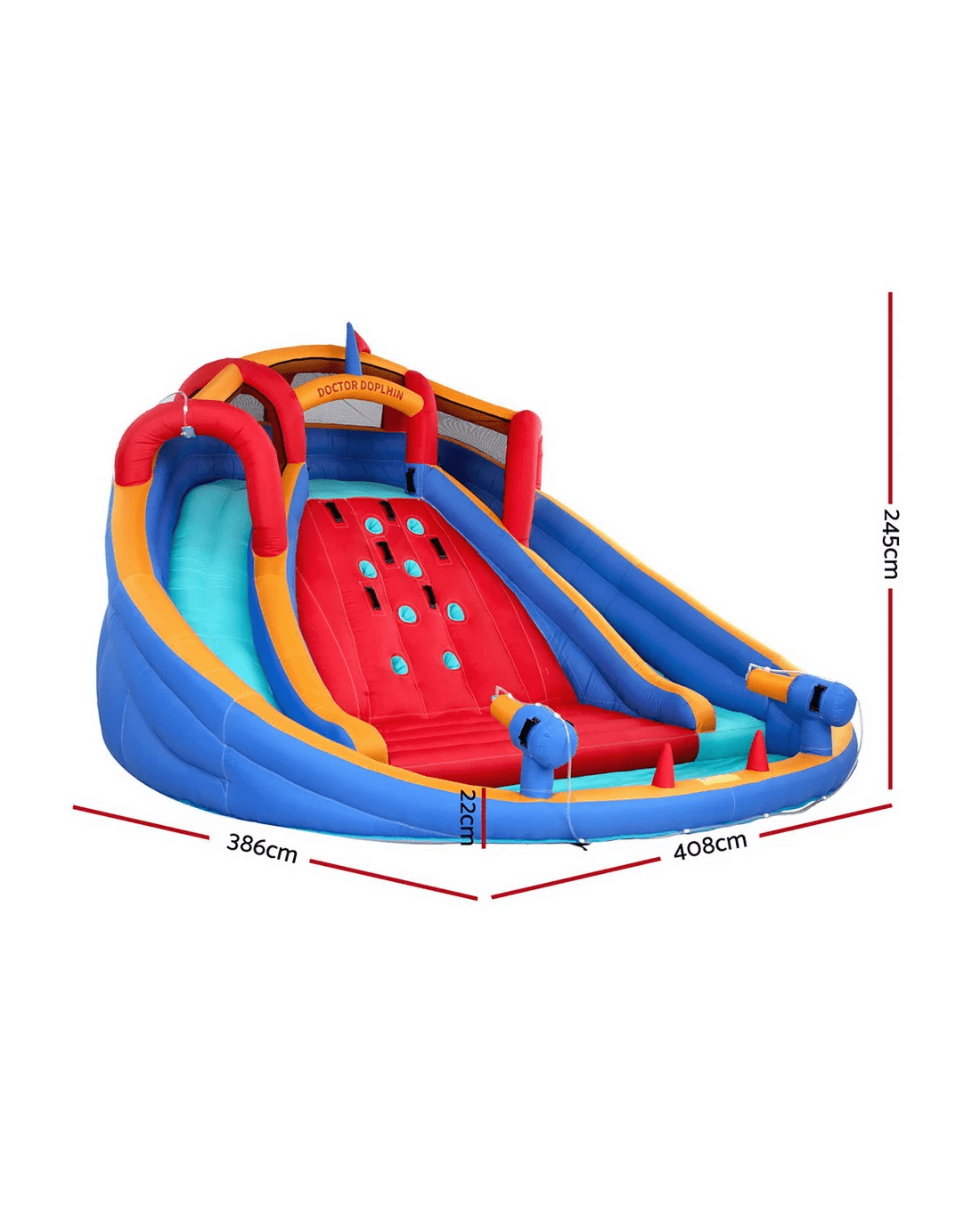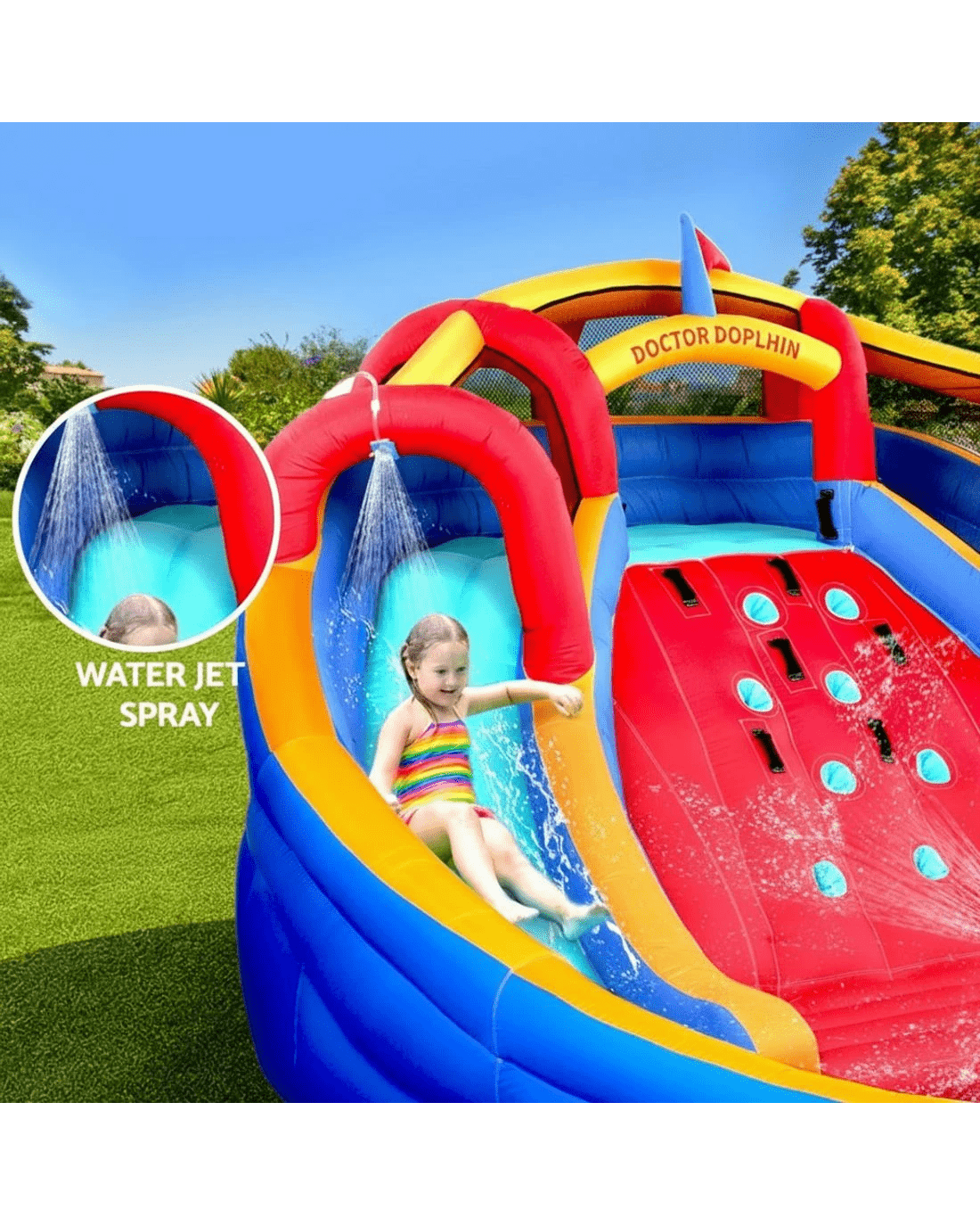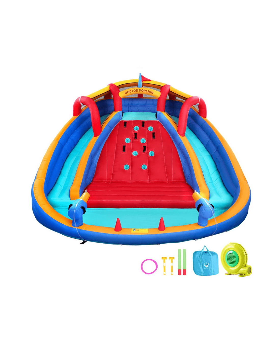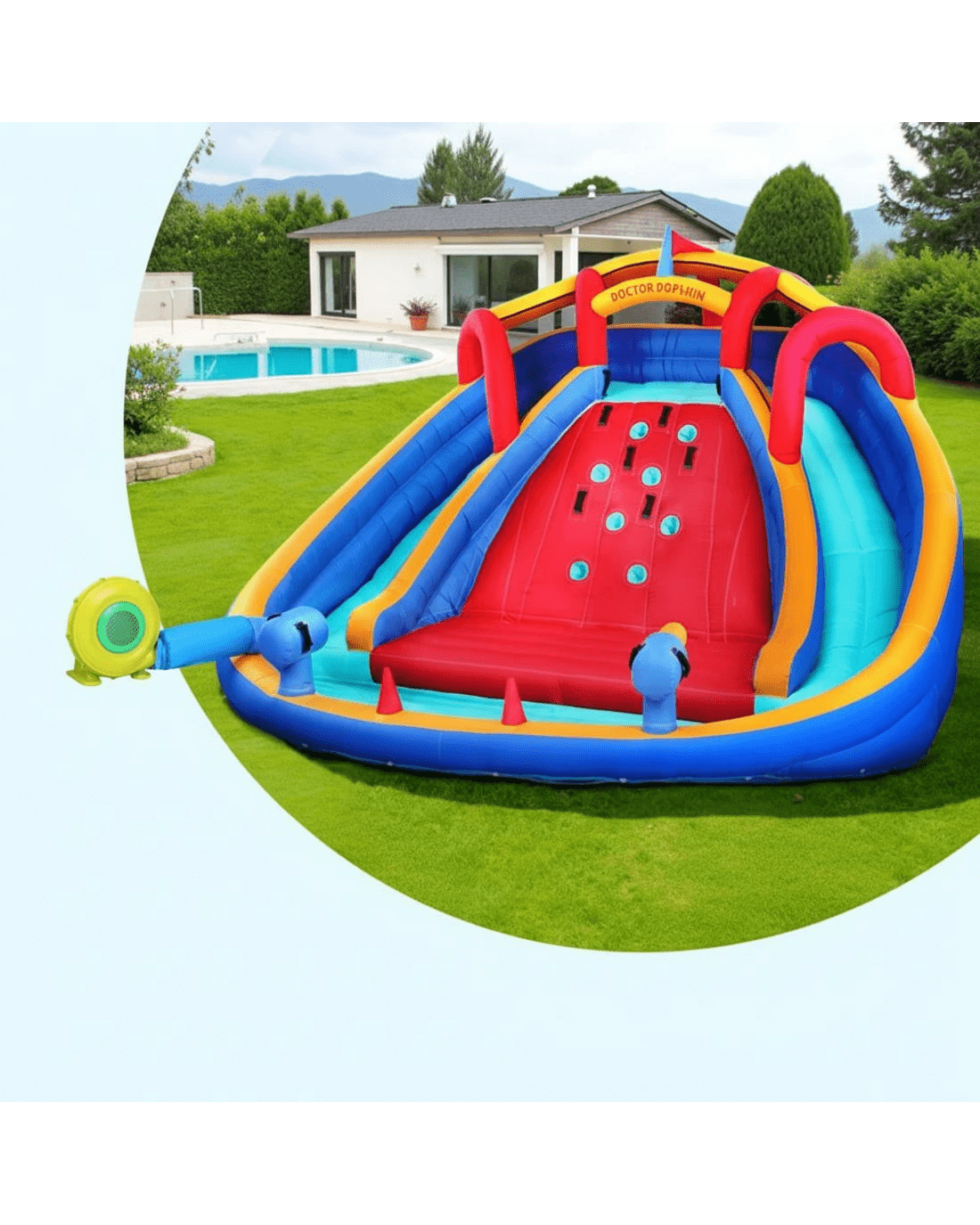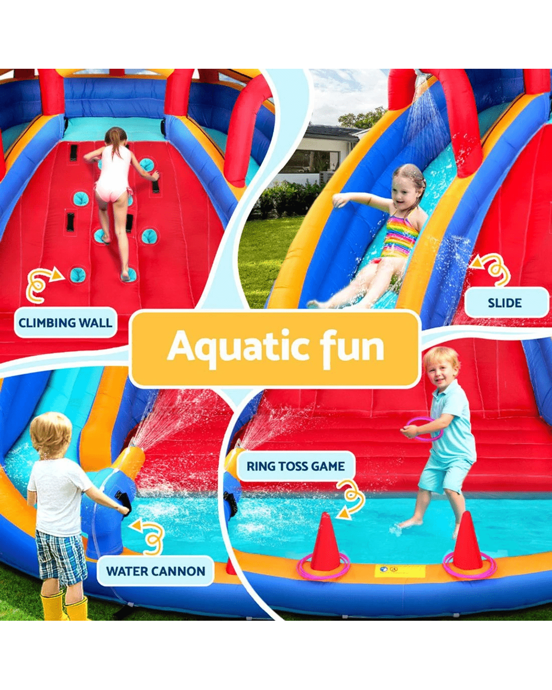 Kids water park with two slides, climbing wall, toss game and water cannon