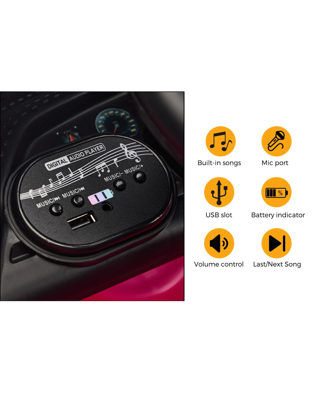 Fun is not confined to just the drive as the vehicle features a button control-enabled steering wheel and digital dashboard fitted with various in-car entertainment such as built-in songs, a horn and MP3 connect to liven the drive in more ways than one. Plus, your child can also play their favourites driving tunes with the memory card insert in the vehicle.