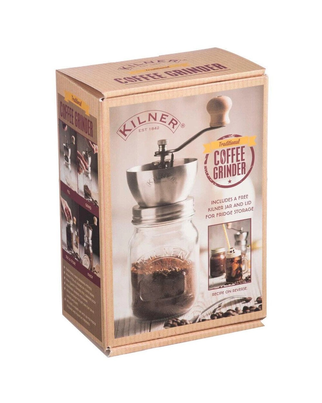 The Kilner Coffee Grinder helps to make a great cup of coffee by grinding coffee beans into a fine powder, ready to use in a plunging cafetiere or other filter coffee makers. The grinding mechanism is made from high quality stainless steel and ceramic parts with adjustable settings to control the thickness of the crushed coffee powder.Once the coffee powder is collected into the jar, add the lid provided to capture the flavours and keep the contents fresher for longer.For the ultimate freshness, store in a fridge until ready to use.The glass jar is suitable to use in the dishwasher. The mechanism part needs to be hand washed and dried immediately.Set Contains: