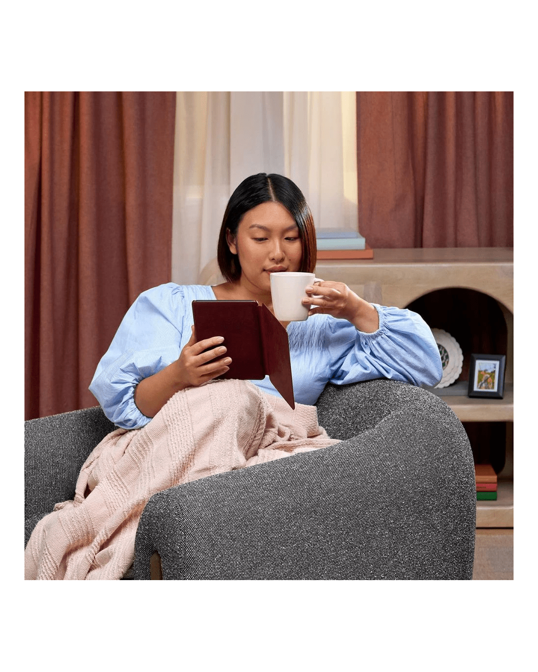 - Your built-in book light: Read in the brightest sunlight or late into the night with an auto-adjusting front light and glare-free display. Adjust the display from a white light to a warm amber.