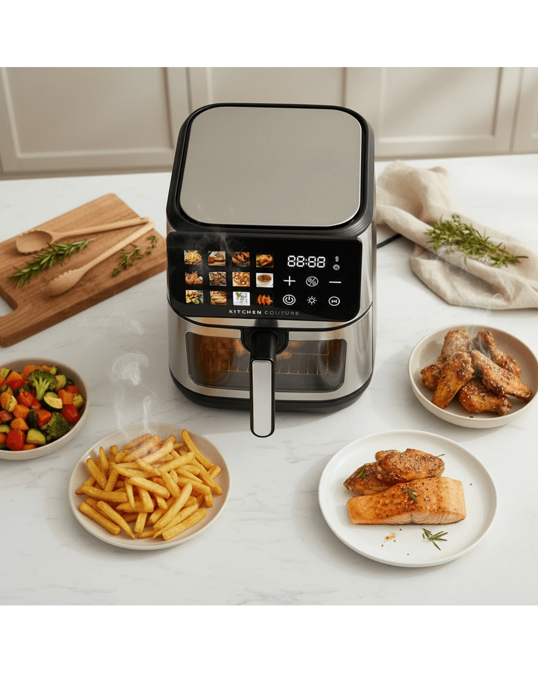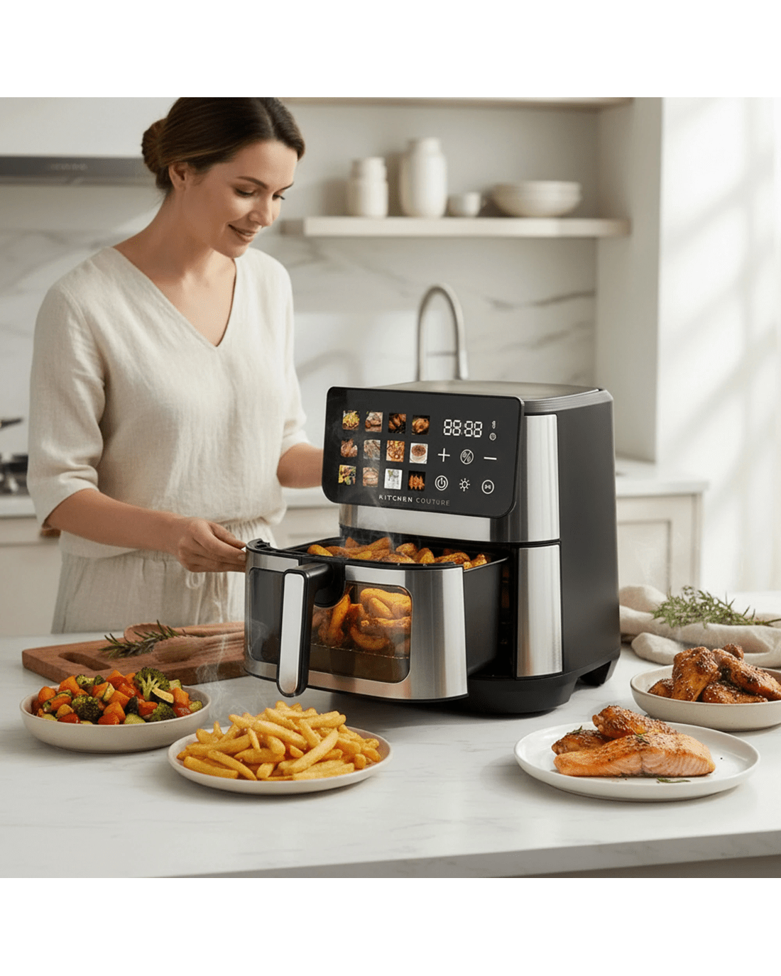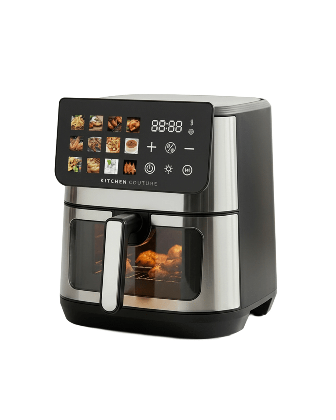 Cook smarter and more evenly with the Kitchen Couture 8.5L Big Screen ClearView Air Fryer, designed for family-sized meals and consistent results. Featuring dual heating elements positioned at the top and bottom, it delivers balanced heat circulation for faster cook times and crisp finishes, without the need to flip food during cooking.