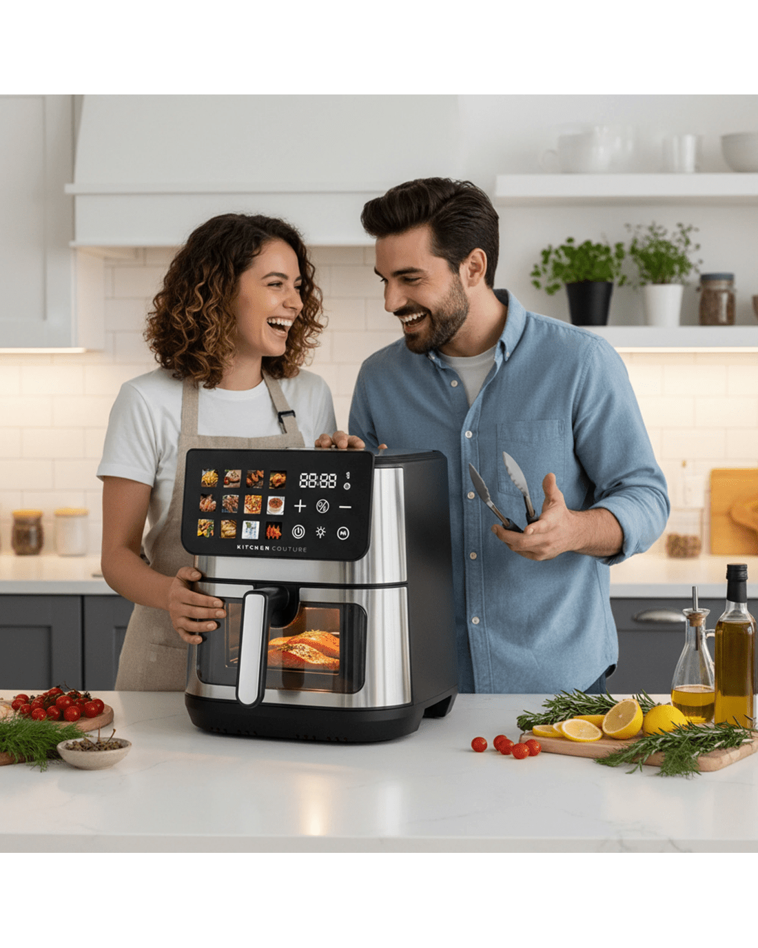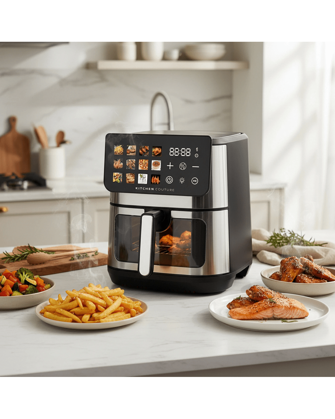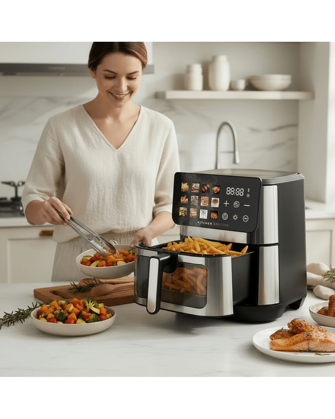 Cook smarter and more evenly with the Kitchen Couture 8.5L Big Screen ClearView Air Fryer, designed for family-sized meals and consistent results. Featuring dual heating elements positioned at the top and bottom, it delivers balanced heat circulation for faster cook times and crisp finishes, without the need to flip food during cooking.