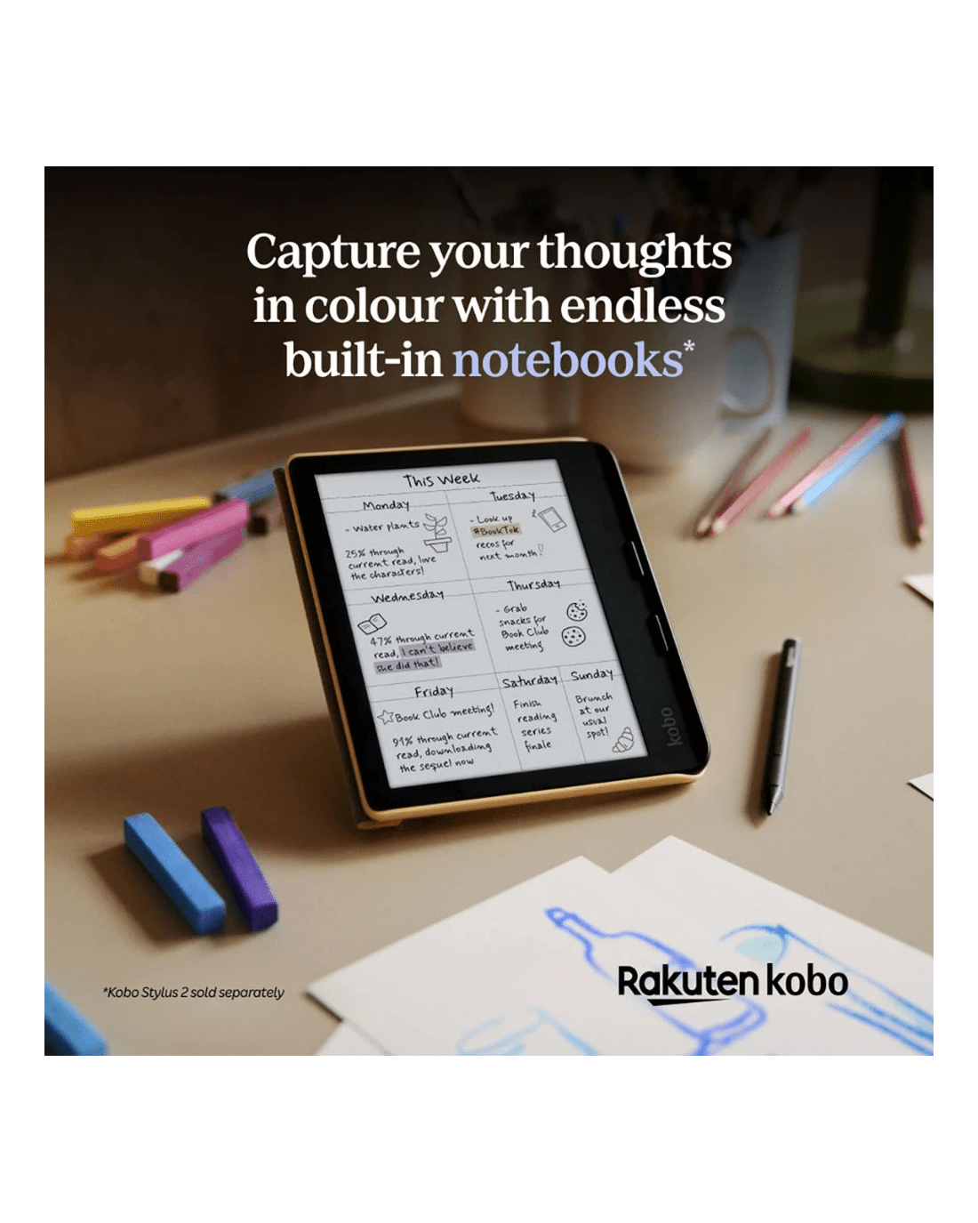 • With Kobo Stylus 2 (sold separately) compatibility, you can mark up and highlight your eBooks in colour.