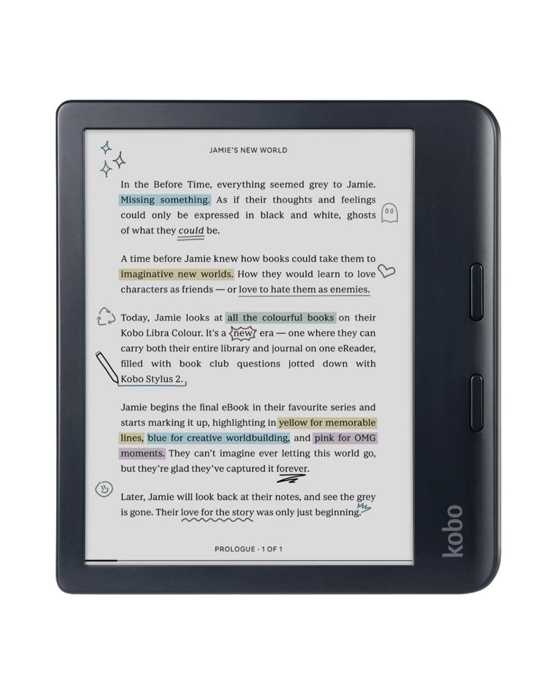 The Kobo Libra Colour lets you read and mark up your beloved stories in full colour. Bring magic to your margins by annotating your pages, organizing your thoughts, and highlighting inspiring lines.