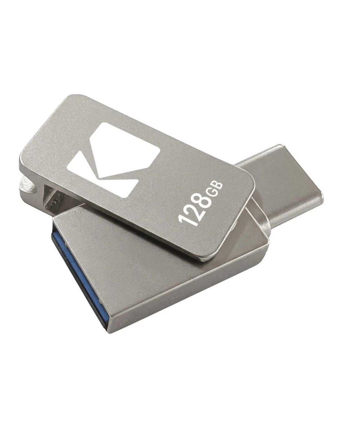 The Kodak 128 GB Dual USB Flash Drive drive is designed for simple and fast file transfers between smartphones, tablets and computers. With both USB A and USB C connectors, it provides an easy way to back up files, free up device storage and move data across multiple devices. Its sleek swivel design keeps the connectors protected while maintaining a compact and portable form.
