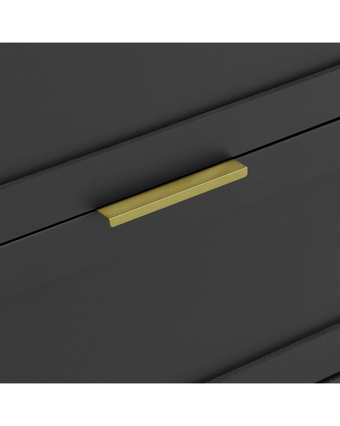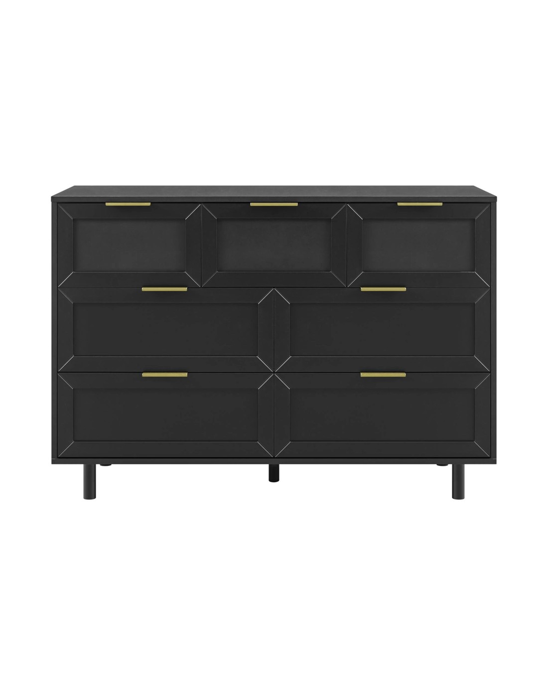 Introducing the perfect storage unit for your bedroom essentials. Crafted with attention to detail, the Quincy drawer unit boasts a modern design that seamlessly blends with any decor.Featuring seven generous drawers, it provides ample room for storing your clothes and bedroom essentials, helping you maintain a clutter-free environment for a peaceful night's sleep.Constructed from high-quality black particleboard and MDF, this storage unit is not only durable but also exudes a contemporary charm that elevates the aesthetics of your room. The sleek gold handles adds a touch of sophistication, making it as visually appealing as it is functional.Overall assembled dimensions: 120cmW x 40cmD x 82cmHProduct details and features:Made from laminated particleboard and MDF7 drawers with smooth metal runnersSleek gold handlesAssembly instructions includedThis product is supplied flat packed in 2 cartons and requires assembly. Recommended two-person assembly.WARNING: Children have died from furniture tipover.ALWAYS secure this furniture with an anchor deviceNEVER allow children to stand, climb, or hang on drawers or shelvesNEVER open more than one drawer at a timeNEVER put a television on this item