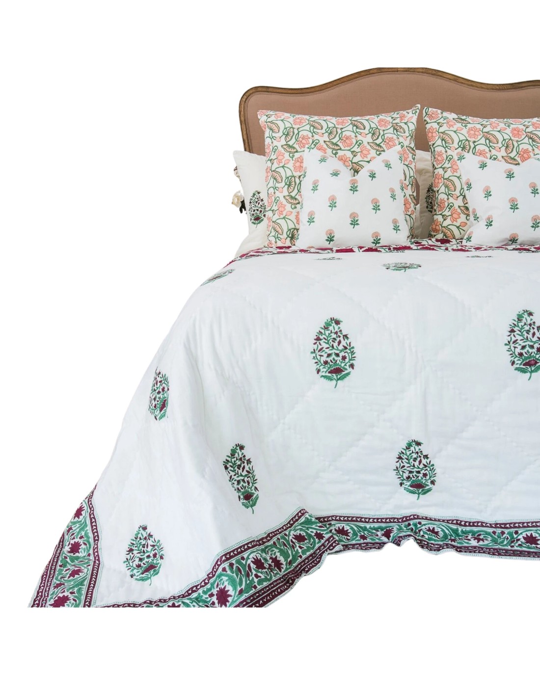 Delicate Kaner flowers adorn this stunning quilt in the shades of ruby red and pine green, evoking a sense of joyful paradise to your bedroom, complementing a colonial style decor. So versatile in nature that you can use it as a cozy summer quilt, a quilted bedspread or as a decorative throw. Makes a perfect gift for that occasion or a fabulous new addition to your own bedroom.