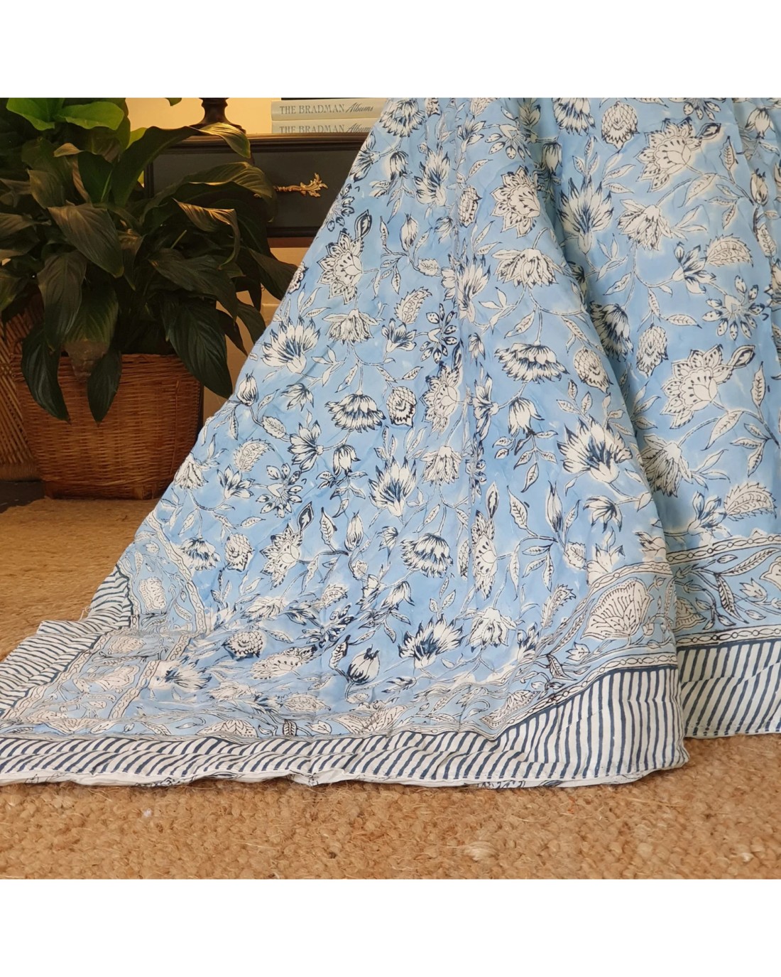 Flowering vines in a light blue watercolour reminds us of the beautiful ocean. This soft luxurious reversible quilt with fine layer of printed cotton hold between them hand-fluffed carded cotton, that provides cosy warmth in the colder months and the not so heavy feel in summer.