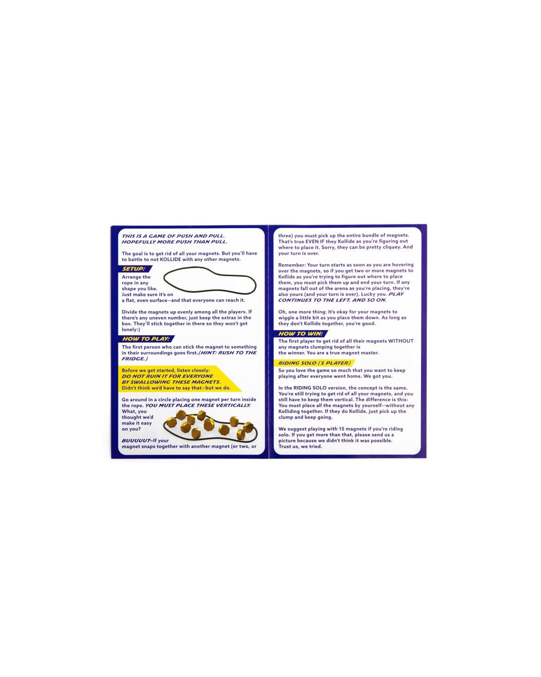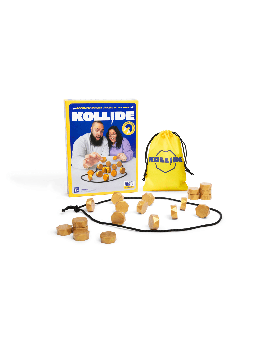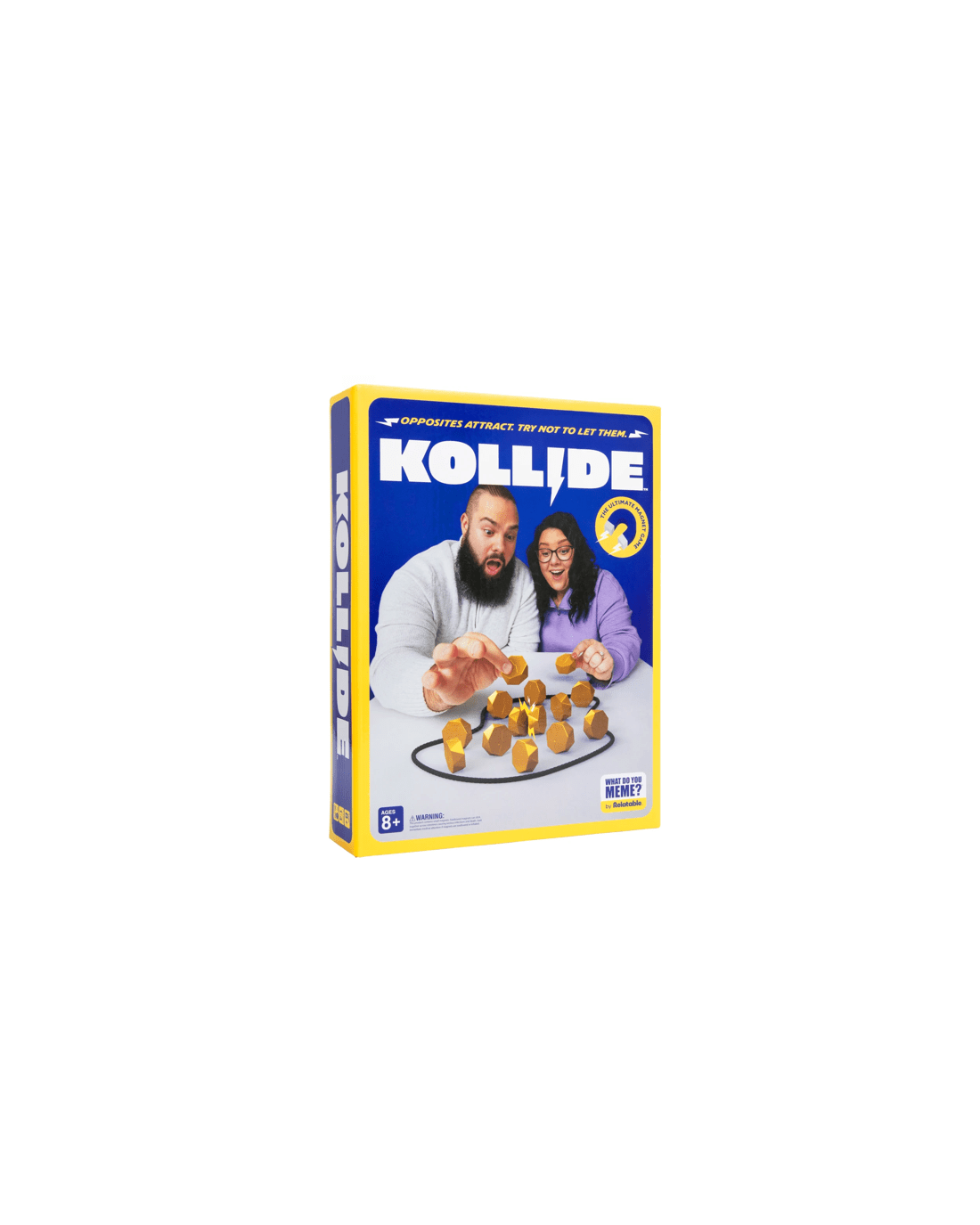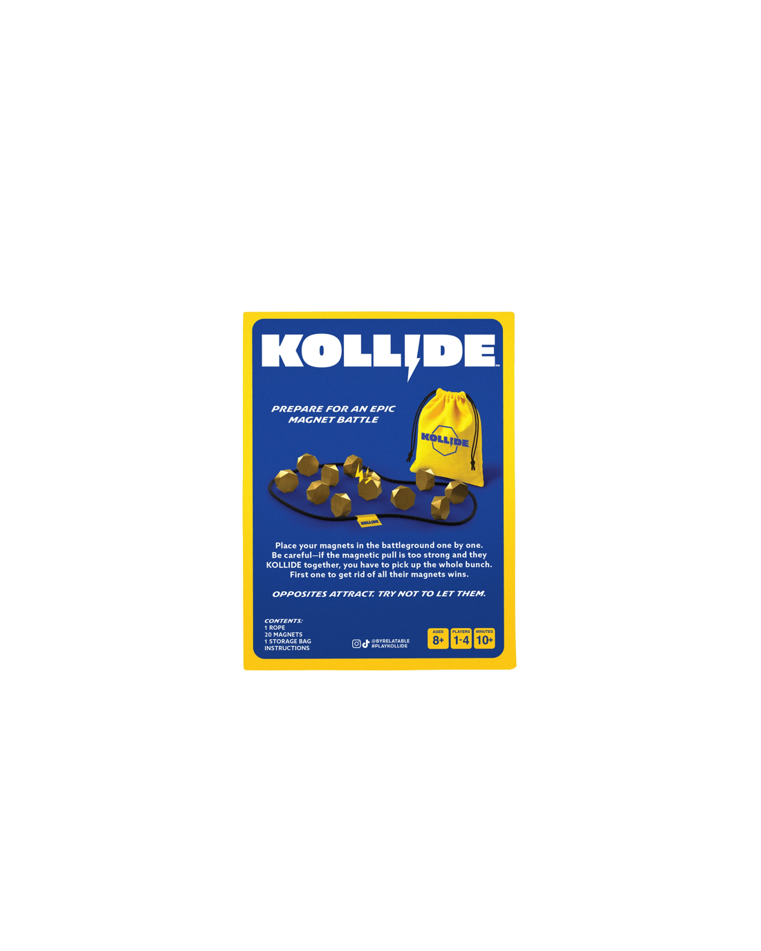 KOLLIDE is a fast, laugh-out-loud magnet battle where every move is a risk. Drop your magnet into the arena one by one - but if the magnetic pull is too strong and they KOLLIDE together, you have to pick up the whole clump. Get rid of all your magnets first to win.