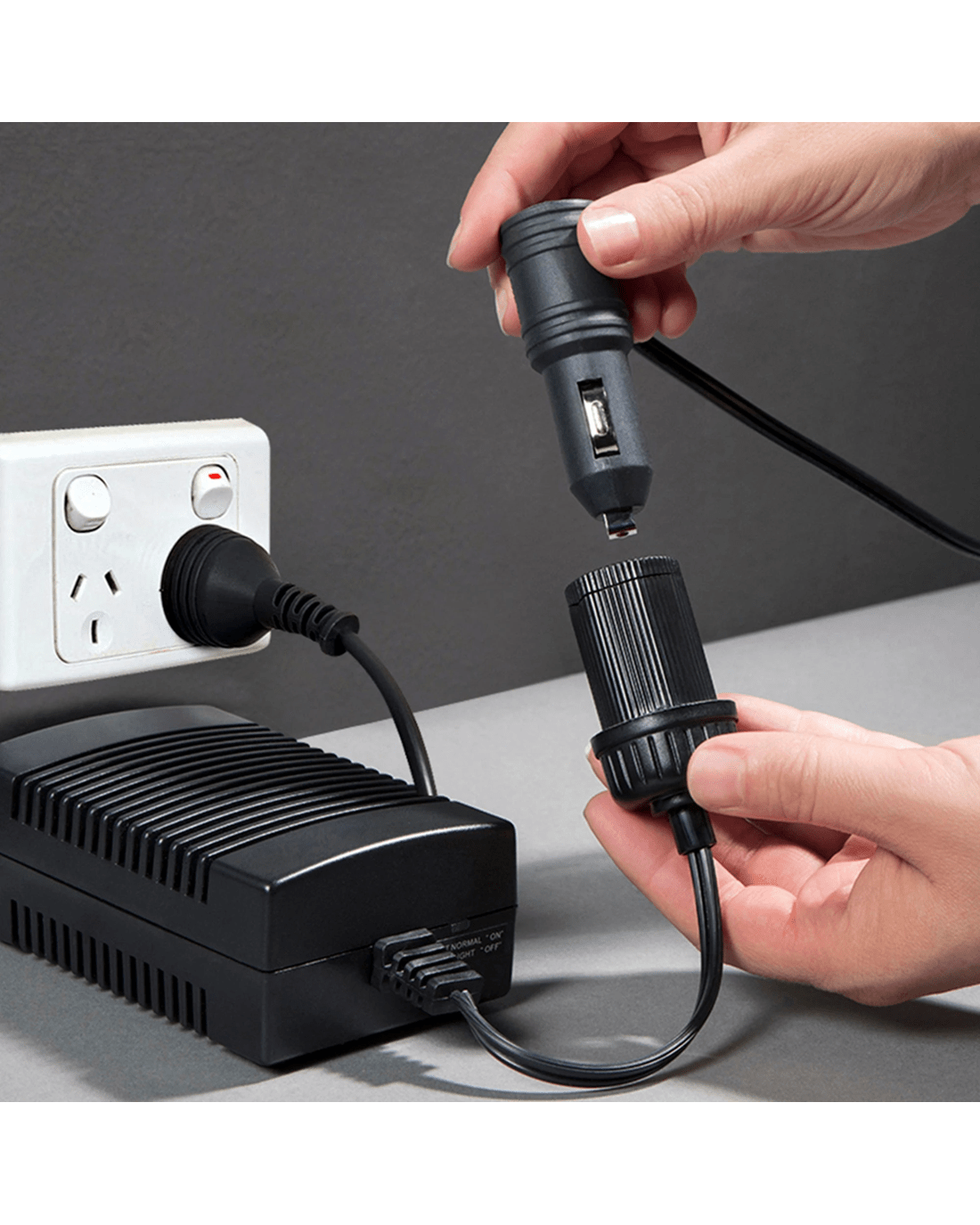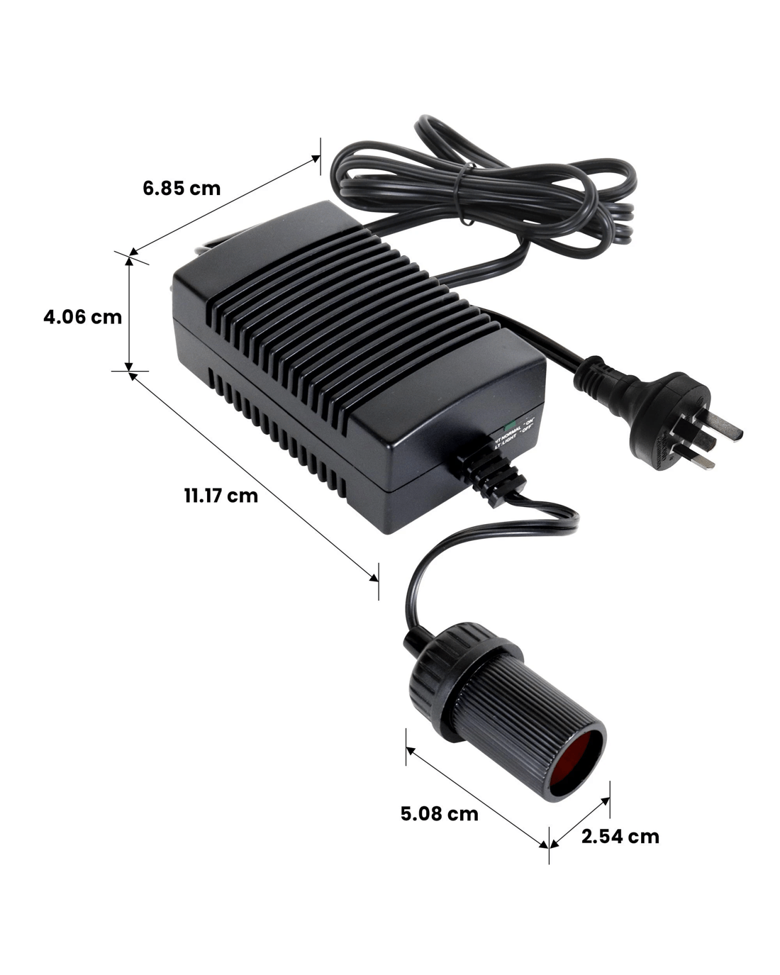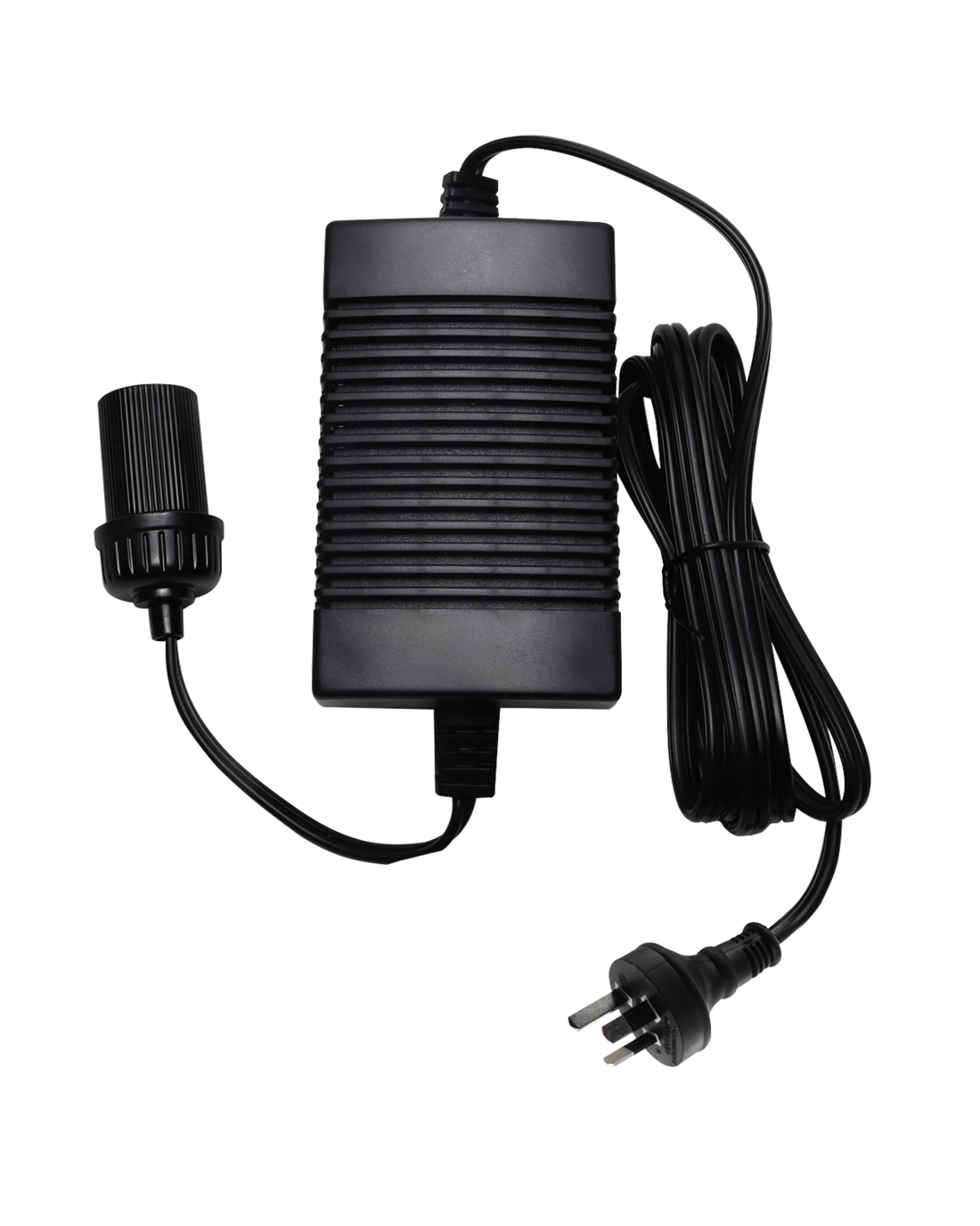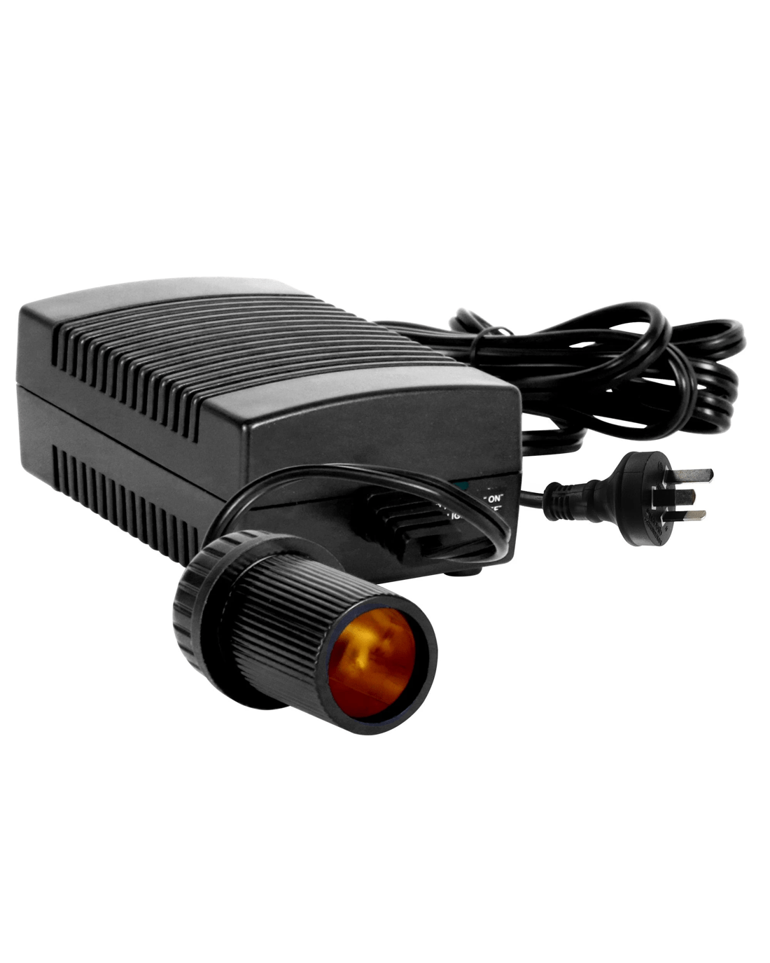 Universal power adapter for your 12V portable devices: This product features an Australian rated plug. It is compatible with 220-240 VAC. . With one simple cable you can double the versatility and usefulness of your travel accessories - convert your truck's cool box to a bar fridge, use your car fan to cool the inside of your caravan, or inflate all your pool toys without worrying about your battery! This universal adapter is suitable for any 12V device that draws less than 5 amps and features a built-in circuit breaker with automatic reset plus a 6 ft cord that can easily reach wherever you need