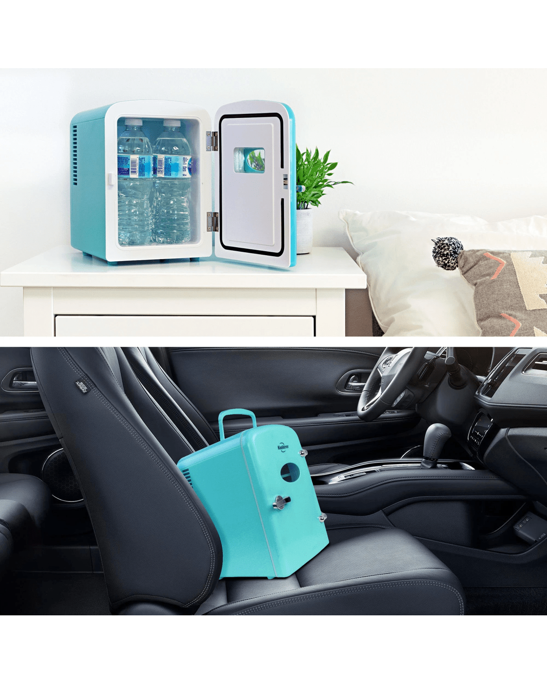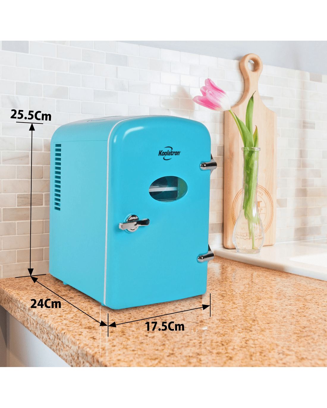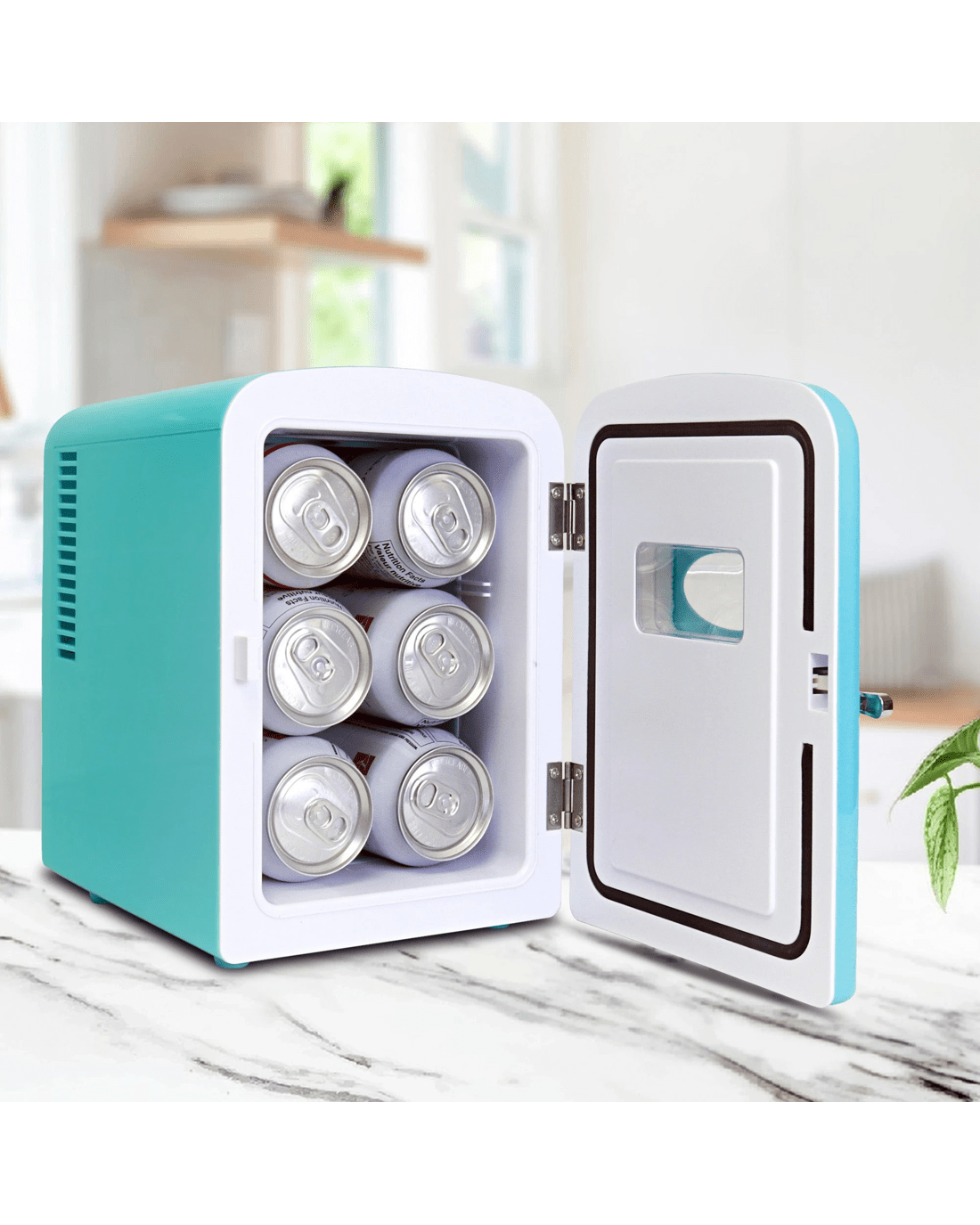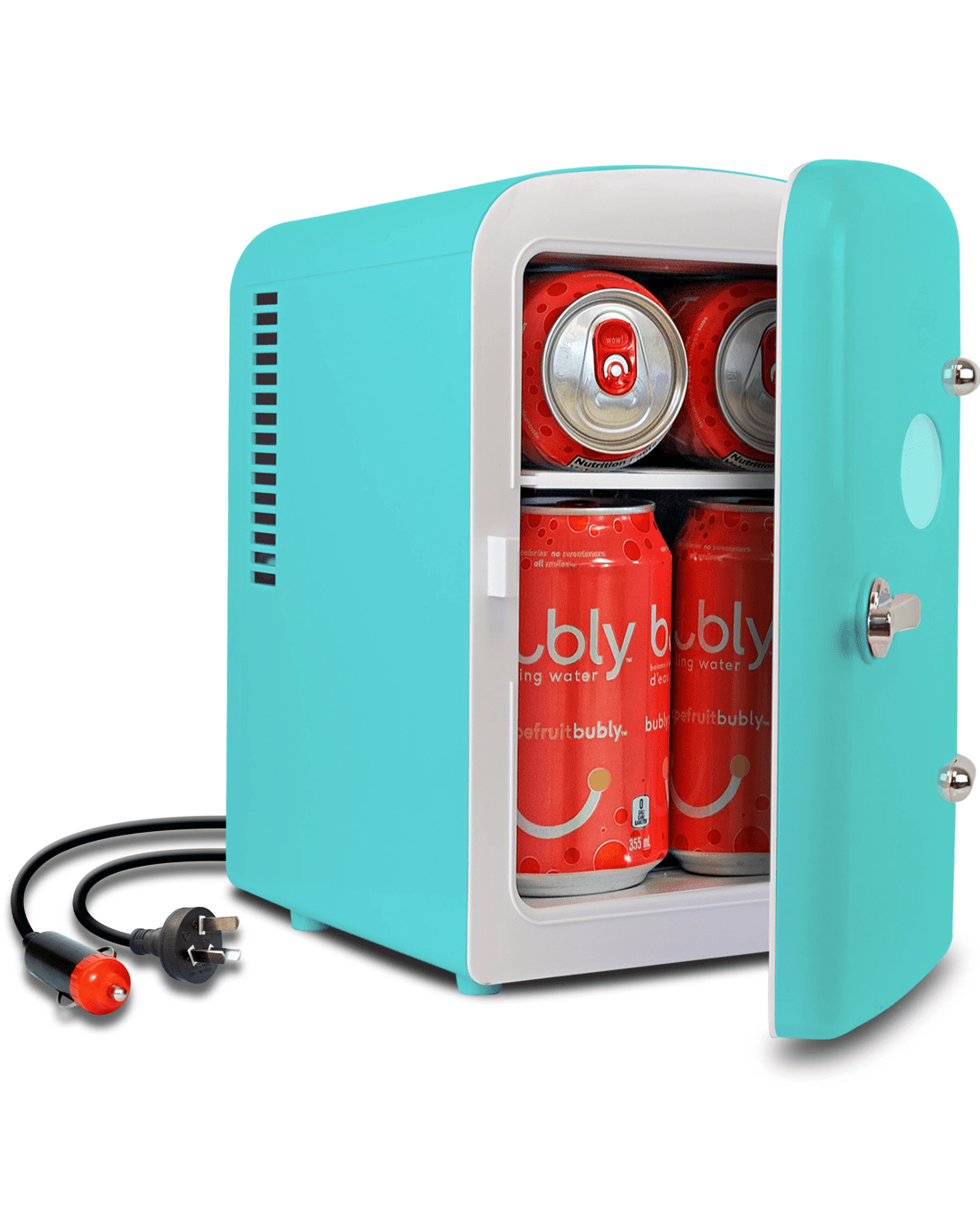 Compact Size with 4L Capacity: Electric cooler with removable shelf and flip-up carry handle holds 6 standard soft drink cans and fits easily on a desk or shelf; Dimensions 17.3 cm x 24.0 cm x 25.4 cm.