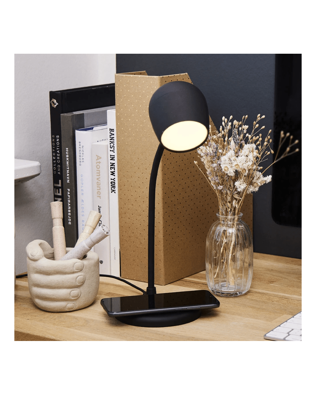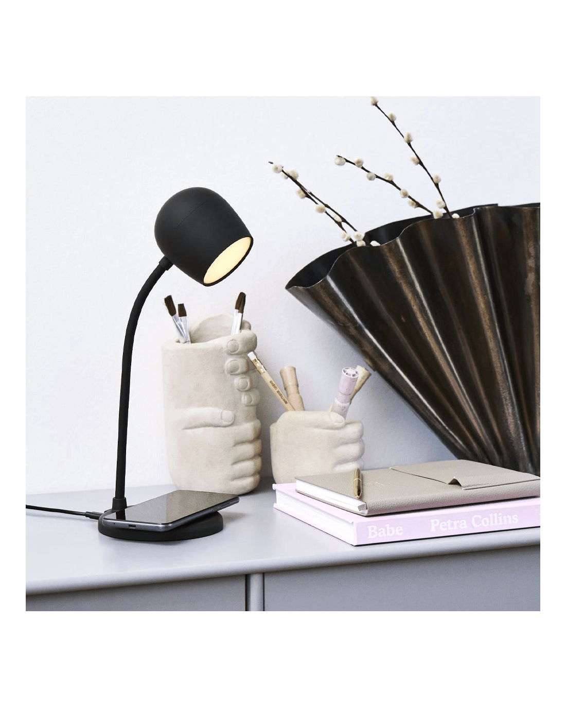 Kreafunk Ellie Lamp W/ Qi Charger And Bluetooth Speaker - Black - Ellie Smart Lamp with Speaker & Wireless Charging.More than just a light, Ellie is a multifunctional companion that elevates your space. Combining ambient lighting, rich sound, and smart convenience, Ellie is designed to simplify and enhance your everyday moments.Versatile & Stylish. Whether it's your desk, bedside, or side table, Ellie fits seamlessly with its modern design and practical features. 3-in-1 Functionality.Lamp: Set the mood with three dimmable brightness levels. Speaker: Enjoy your favourite music via high-quality Bluetooth audio.Wireless Charging: Power up compatible phones, headphones, or speakers directly on its base.Smart Convenience Take hands-free calls with the built-in microphone ideal for multitasking at home or at work.