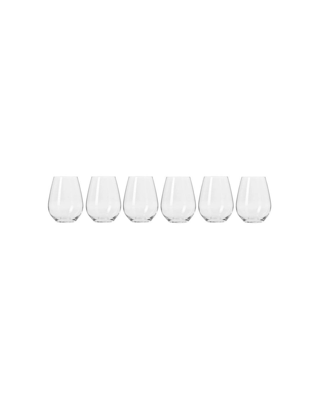 Krosno Harmony 6-piece stemless wine glass set designed for everyday use and home entertaining. Each clear glass holds 440 ml, offering a versatile size for wine and other beverages. Made from durable glass with a modern, stemless silhouette for stability and easy handling. Includes six identical glasses (model KR0267), ideal for casual gatherings or more formal table settings.