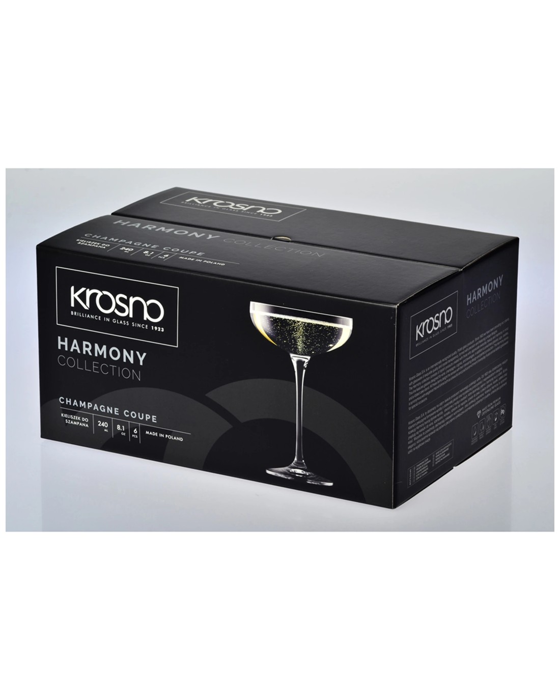 Krosno Harmony 6-piece stemmed coupe champagne glass set designed for elegant serving of champagne and sparkling wines. Each glass is made from clear, high-quality glass and holds 240 ml, offering a refined silhouette that flatters sparkling pours. The classic stemmed coupe shape adds a sophisticated touch to celebrations, toasts, or everyday entertaining. This six-piece set enhances table presentation and pairs easily with a variety of tableware. Model number KR0263.