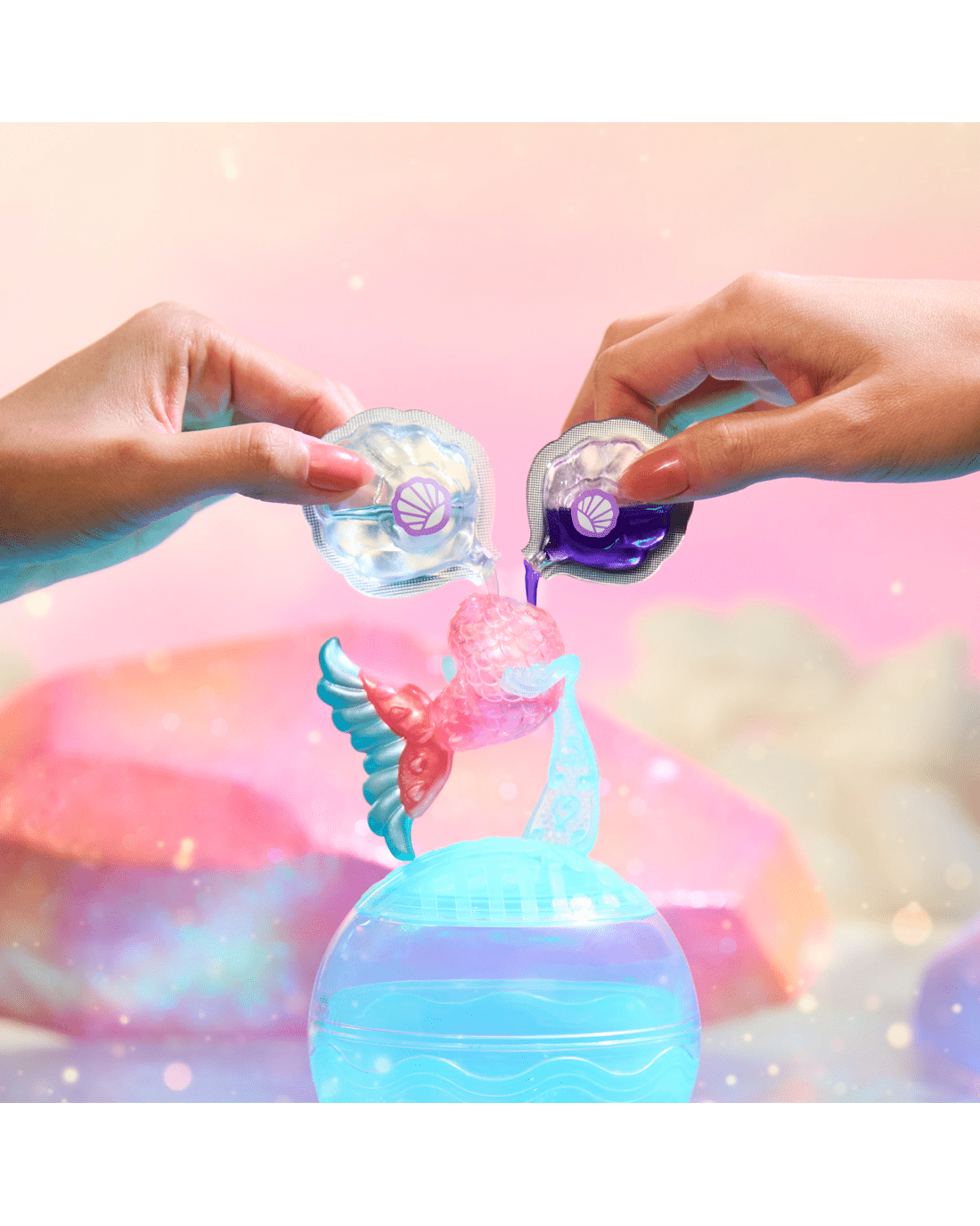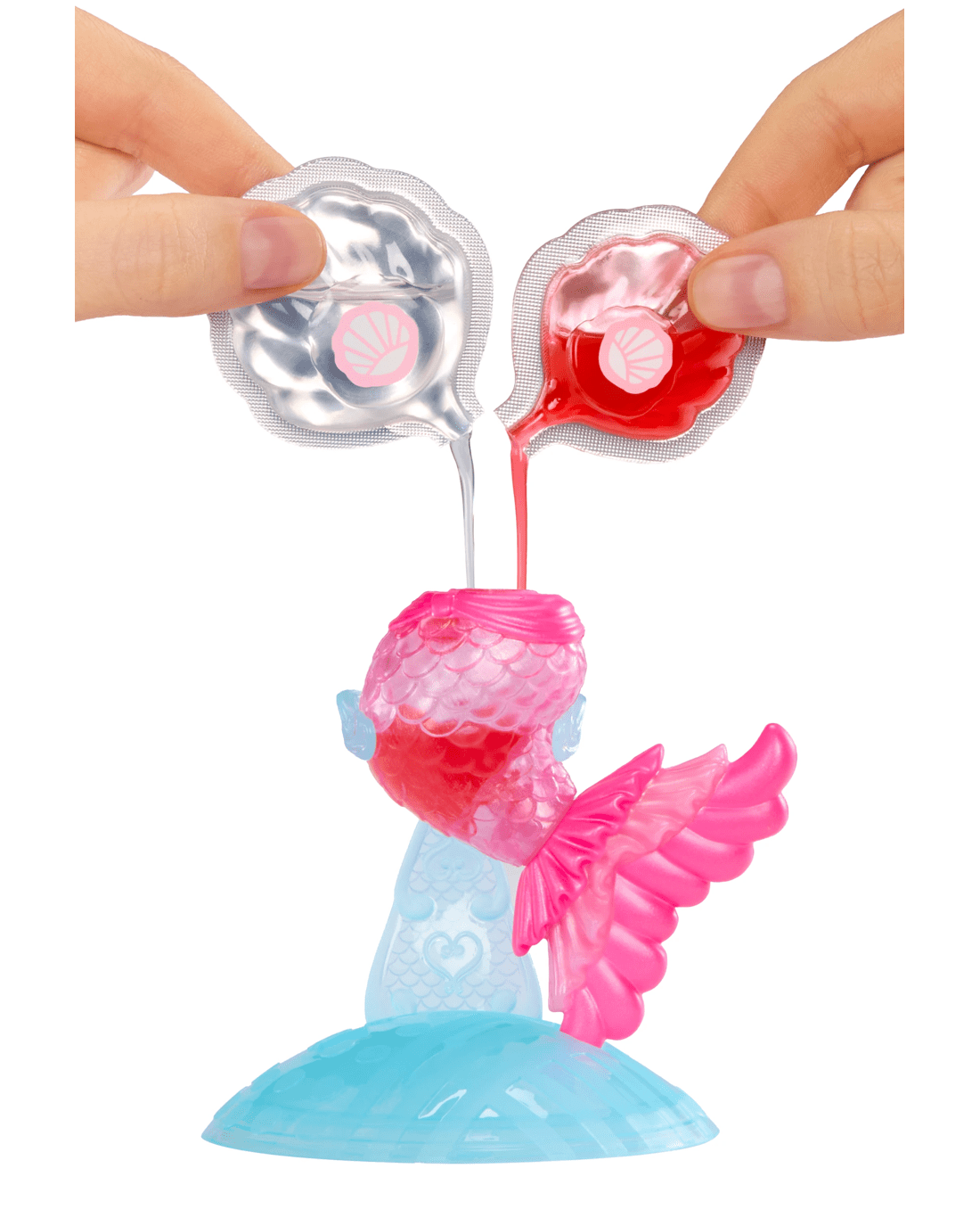 Unbox the magic by removing the shrink wrap and opening your ball, revealing your stylish mermaid, surprise accessories and everything you need to create your custom lip gloss. Pour your two magical seashells filled with your DIY lip gloss into your doll’s clear mermaid tail, then watch as it transforms from clear to a dazzling new colour - the ultimate before-and-after moment!