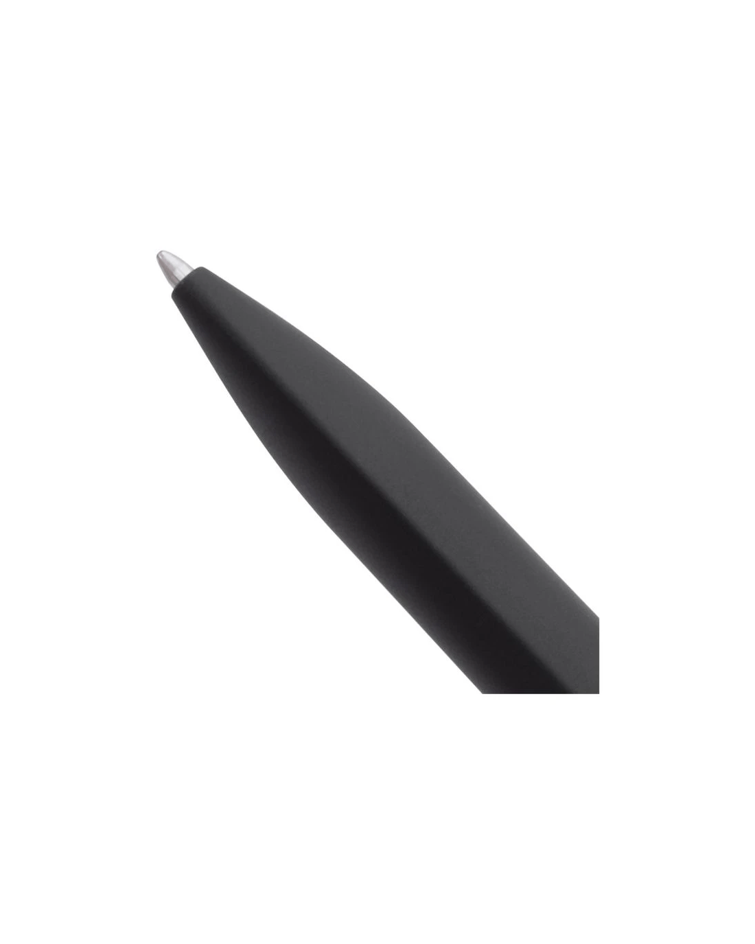 - The pen has a sleek black barrel with a silver clip.