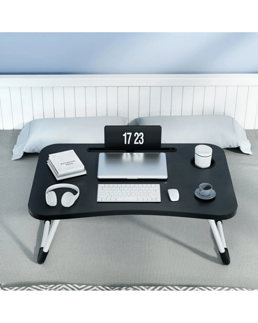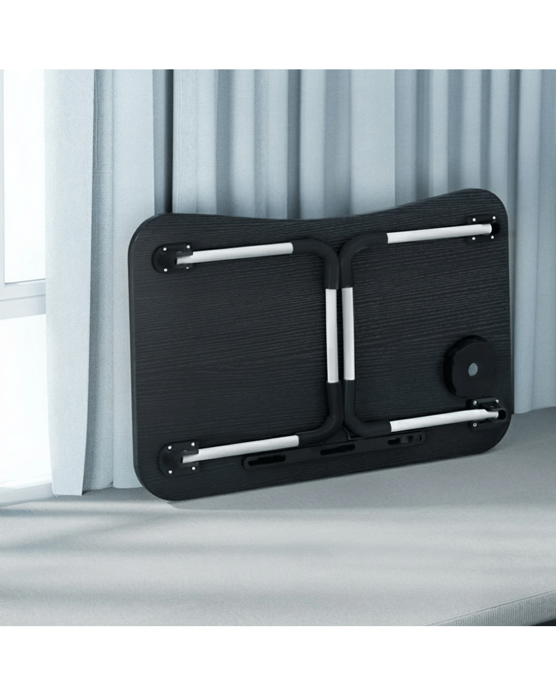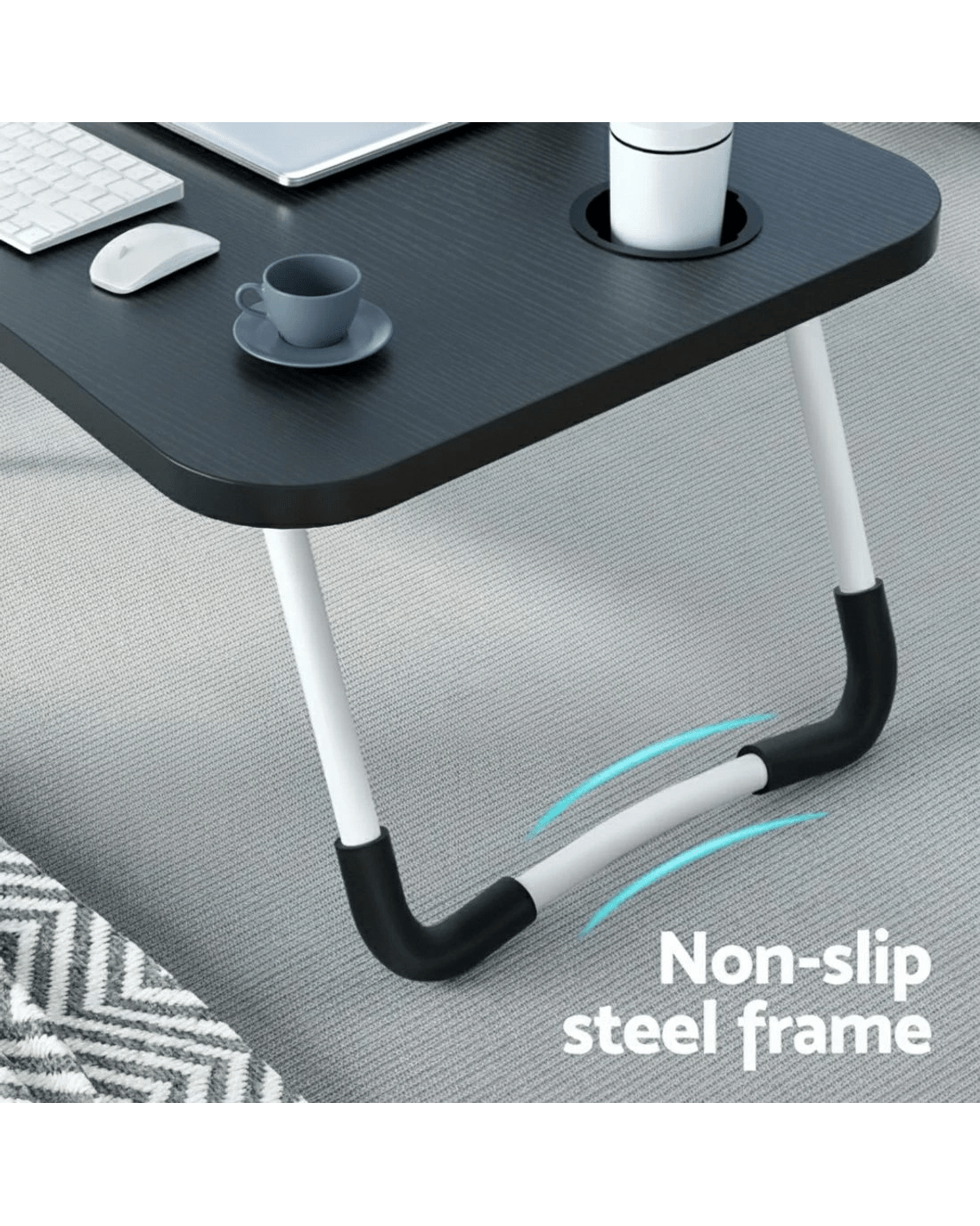 Thoughtfully designed, the desk includes a non-slip steel frame for stability, a built-in slot for tablets or phones, and a handy cup holder for added convenience. Whether you're working from bed, the couch, or outdoors, this desk provides a safe and practical solution to enhance your productivity and comfort.