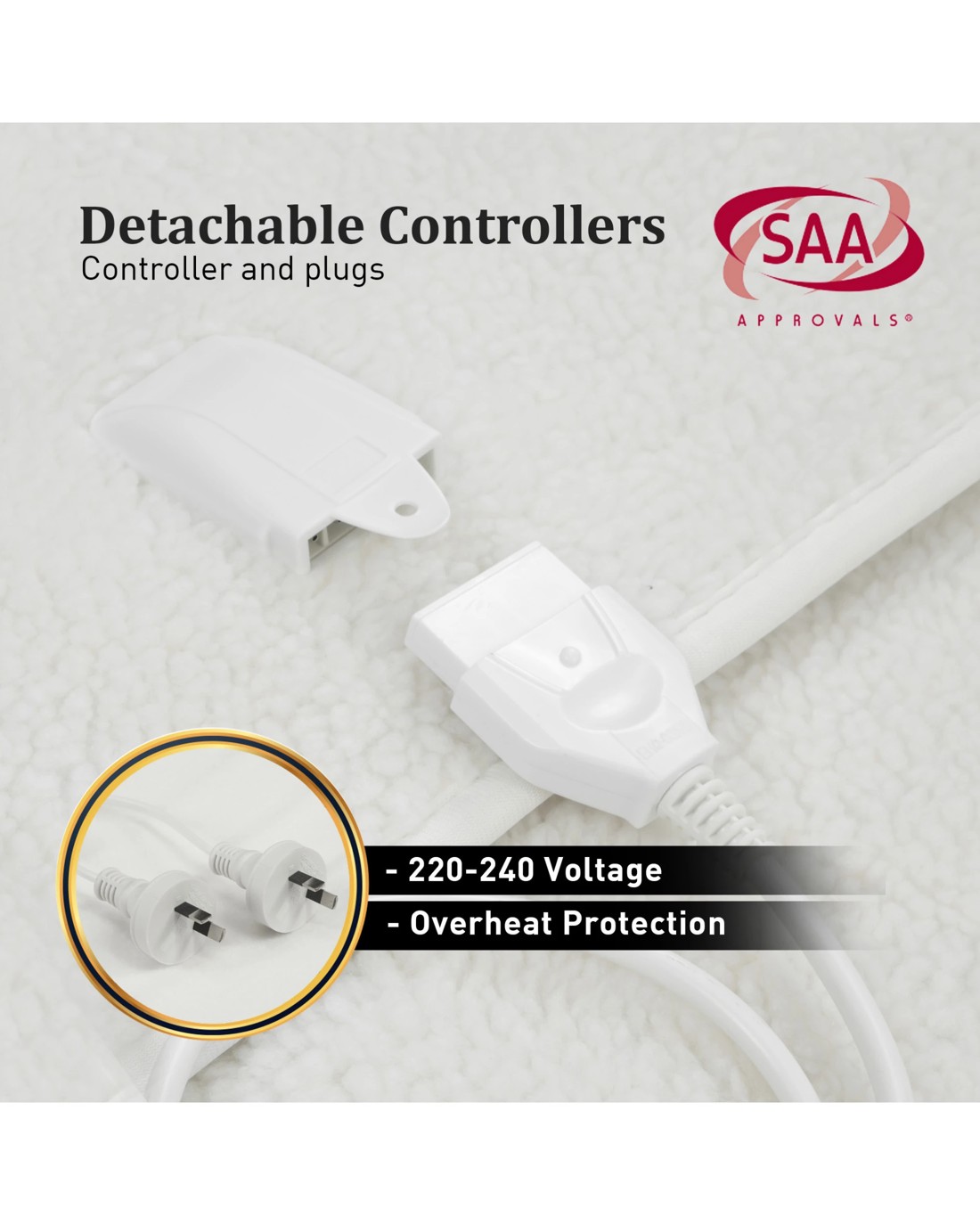 This single-size electric blanket fits over your bed to provide wonderful warmth. It is made with ultra-soft, synthetic wool fabric to give you the ultimate cosy feeling. It is safe and easy to use, with overheat protection and an SAA-approved cable and plug.