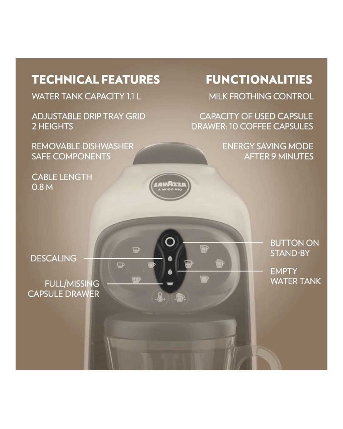 - It is compatible with pods from the Lavazza A Modo Mio System.