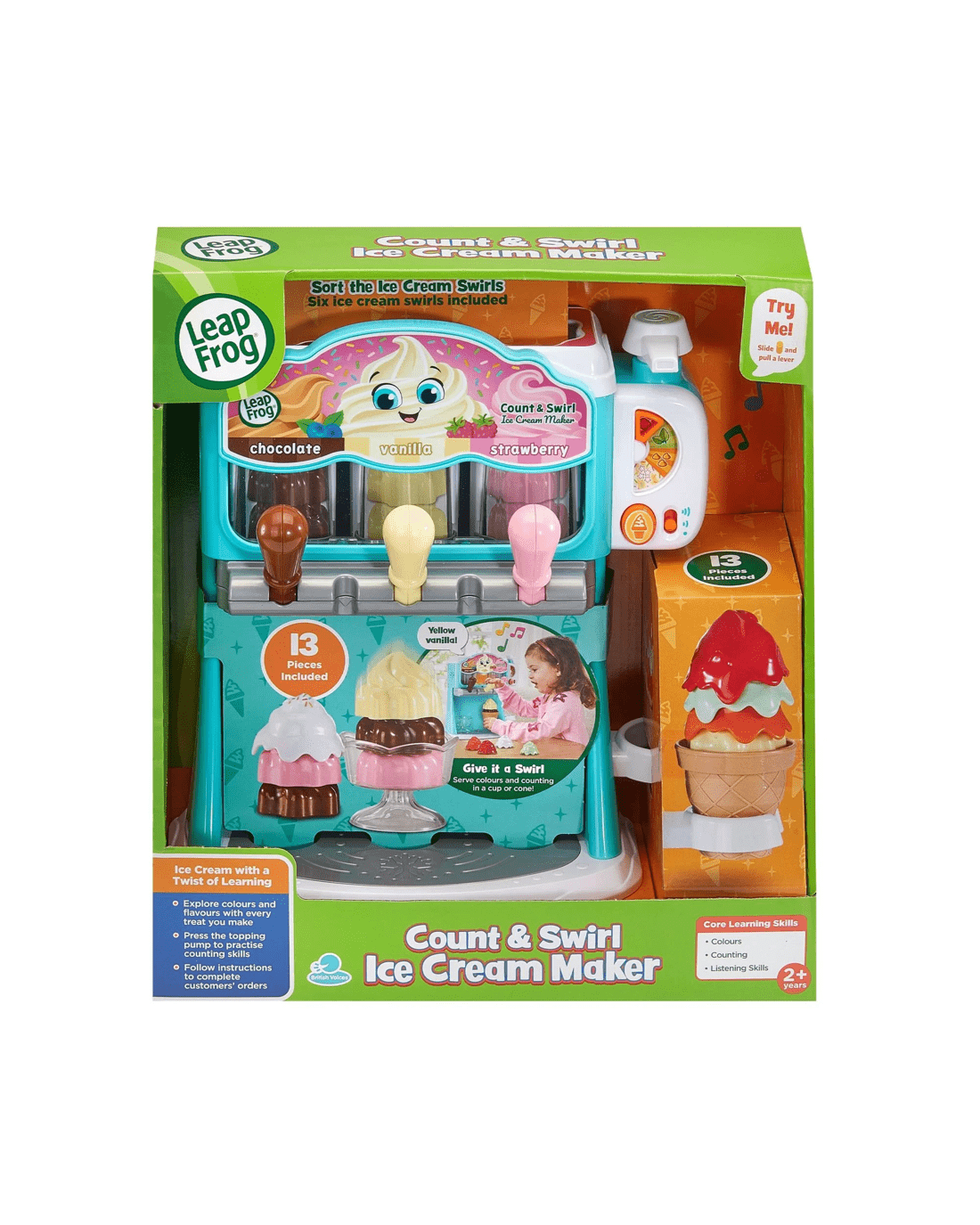 Delight your little ones with the LeapFrog Count & Swirl Ice Cream Maker, where every play session turns into a delicious adventure. Budding chefs can mix chocolate, vanilla, and strawberry swirls, choosing their favourite cup or cone and pulling the levers just like in a real ice cream parlour. It's a fantastic way for children to practise counting as they add fun toppings and complete playful customer orders, while developing listening and colour recognition skills along the way. Get ready to watch imaginations soar with every pretend scoop—this is one toy that's sure to become everyone's favourite. Bring home the Count & Swirl Ice Cream Maker and let the tasty fun begin.