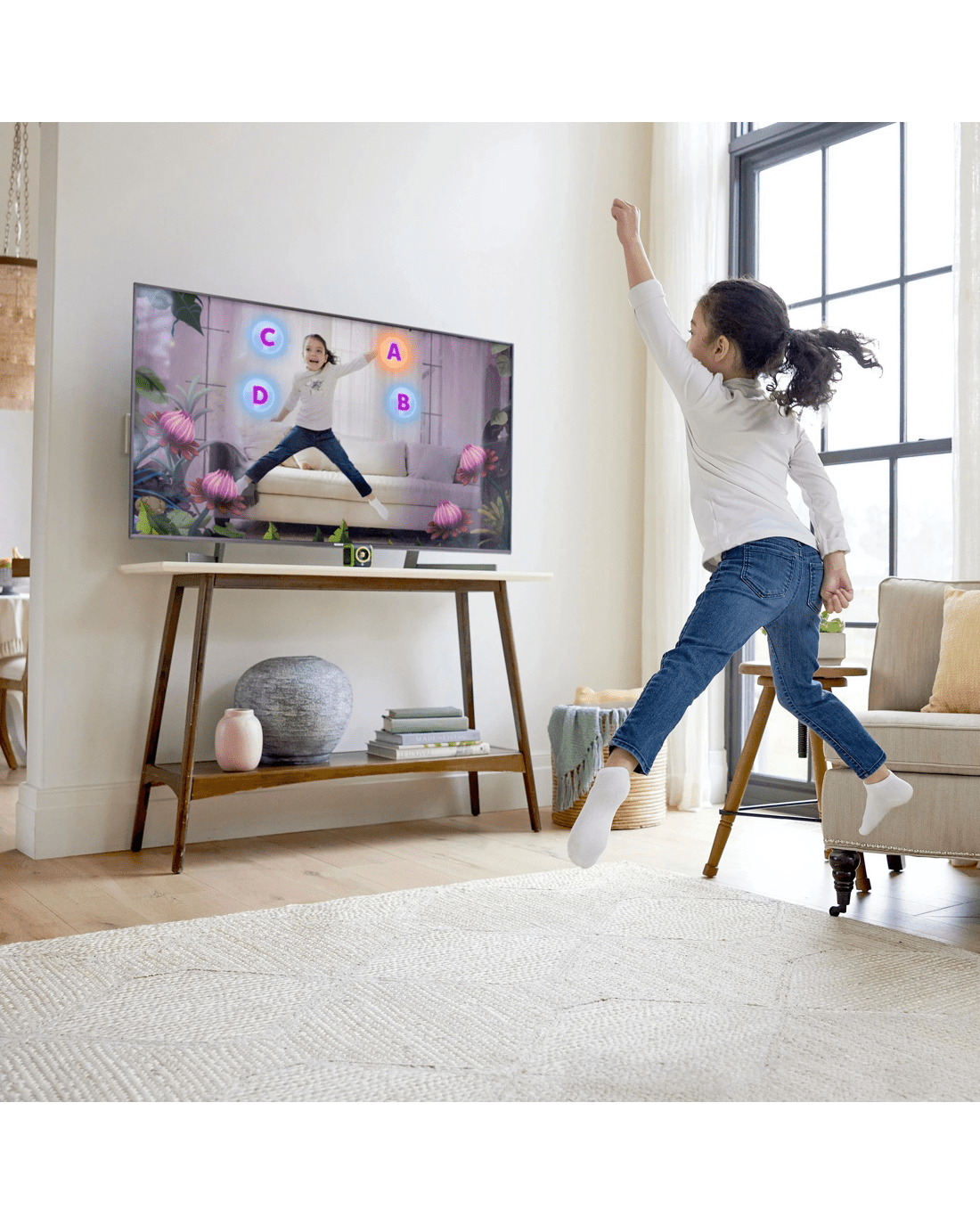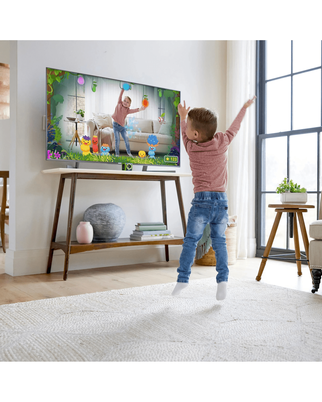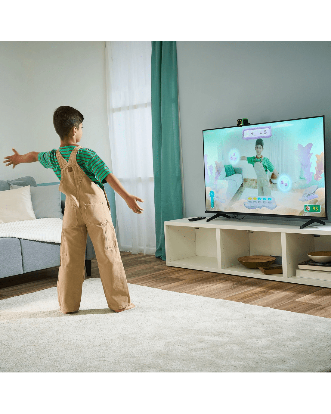 - Mount on top of the TV or place it in front of the TV to play!