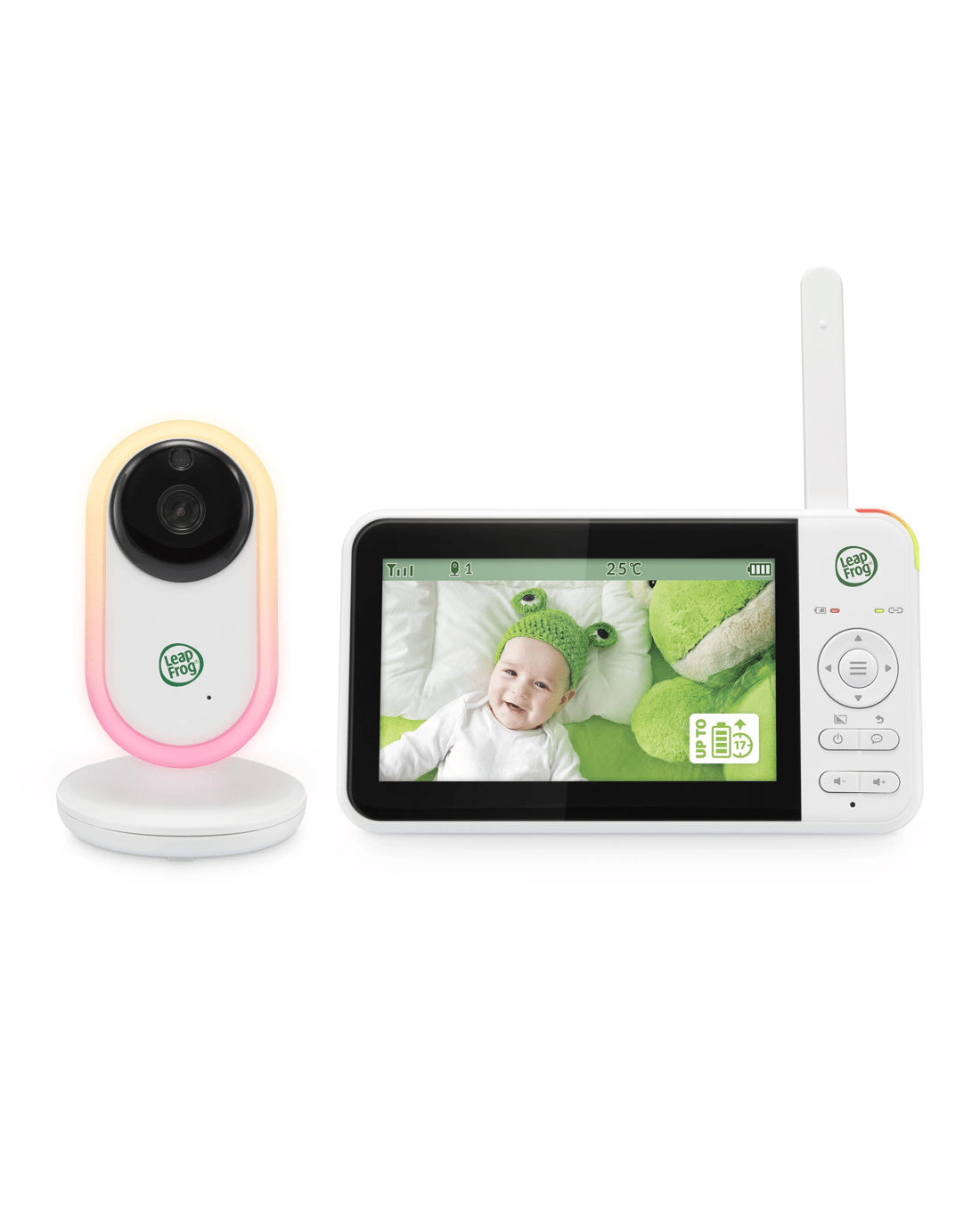 The LeapFrog LF2415 video and audio baby monitor with 2.4GHz FHSS technology for a secure connection and clear sound without interference. The Baby Unit features colour night light, auto night vision and digital zoom. It operates on mains power. Comes with 9 soothing sounds with 5 level volume setting. It also has a temperature sensor, speaker/microphone for 2 way communication with the parent unit and it is wall mountable. The Parent Unit has a 5-inch colour display and uses a high capacity rechargeable battery pack for up to 17 hours of active video monitoring time before re-charging. LCD for room temperature monitoring and speaker/microphone for 2-way communication with the baby unit. It has sound activation mode, low battery audible alert and out of range audible alert.